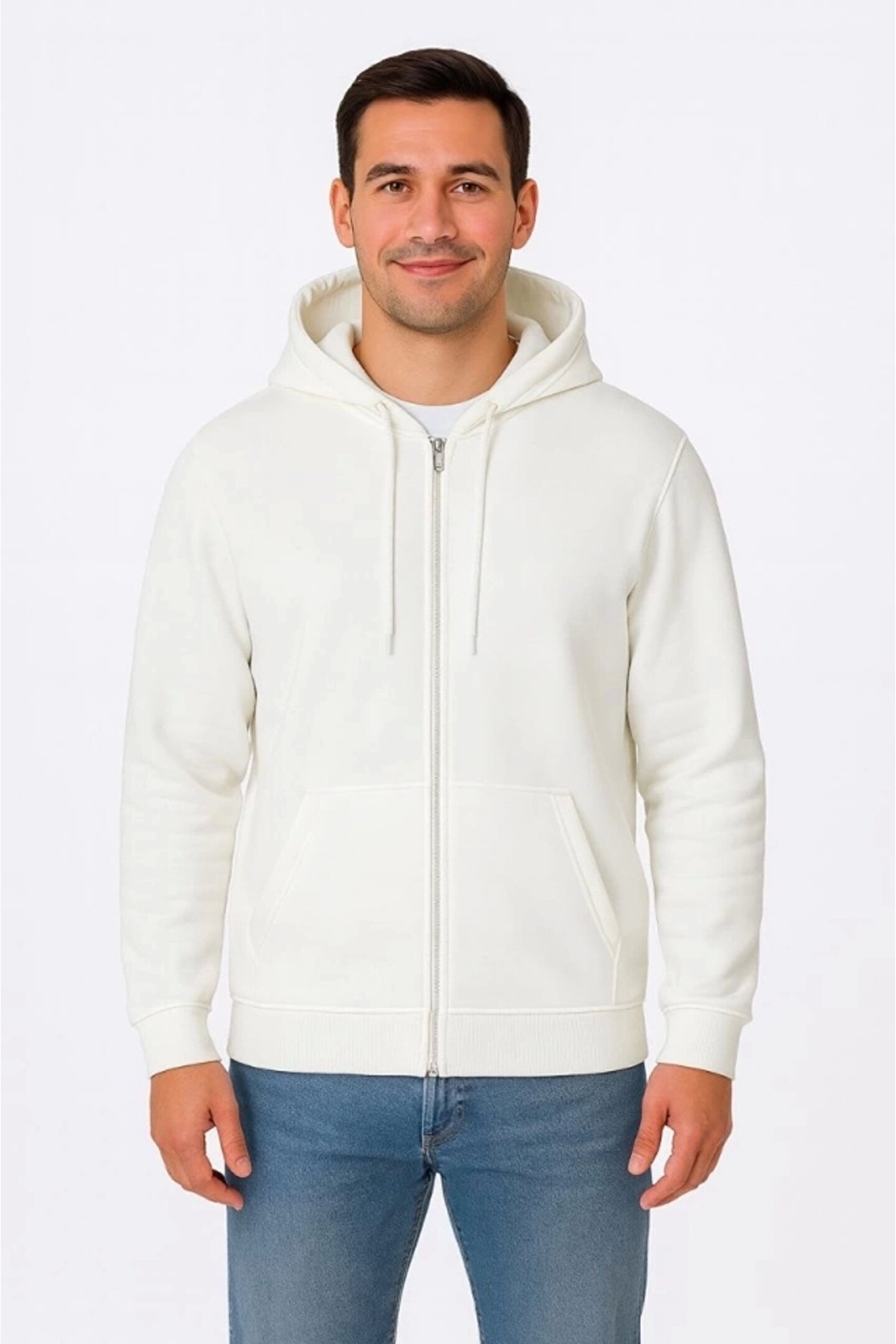 Erkek Üç İplik Kapüşonlu Tam Fermuarlı Kanguru Çepli SweatShirt Hoodie - Beyaz