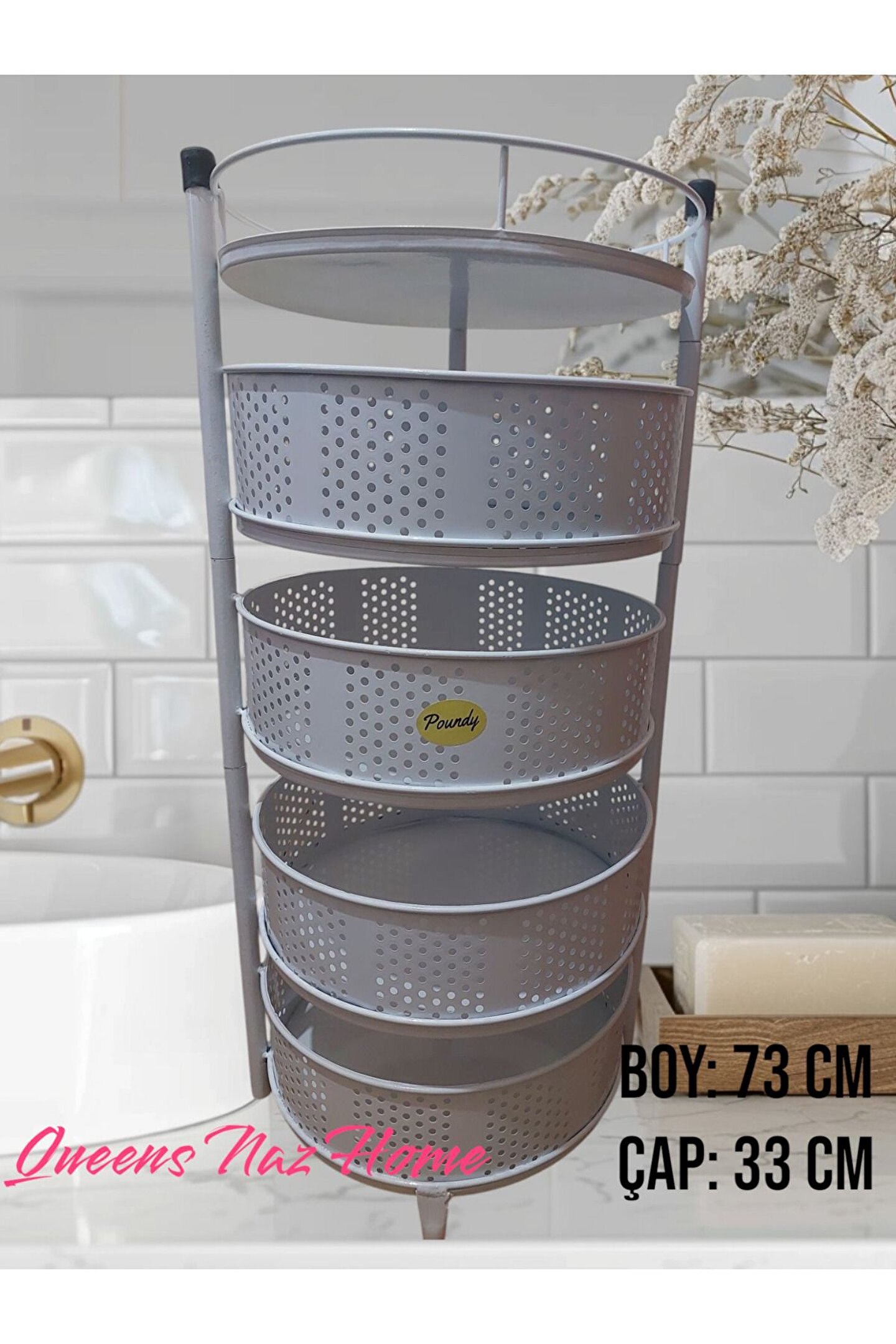 Kule Sebzelik 5 Katlı Tepsili Açılır Metal Patates Soğan Meyvelik Sepetli Rafı Beyaz