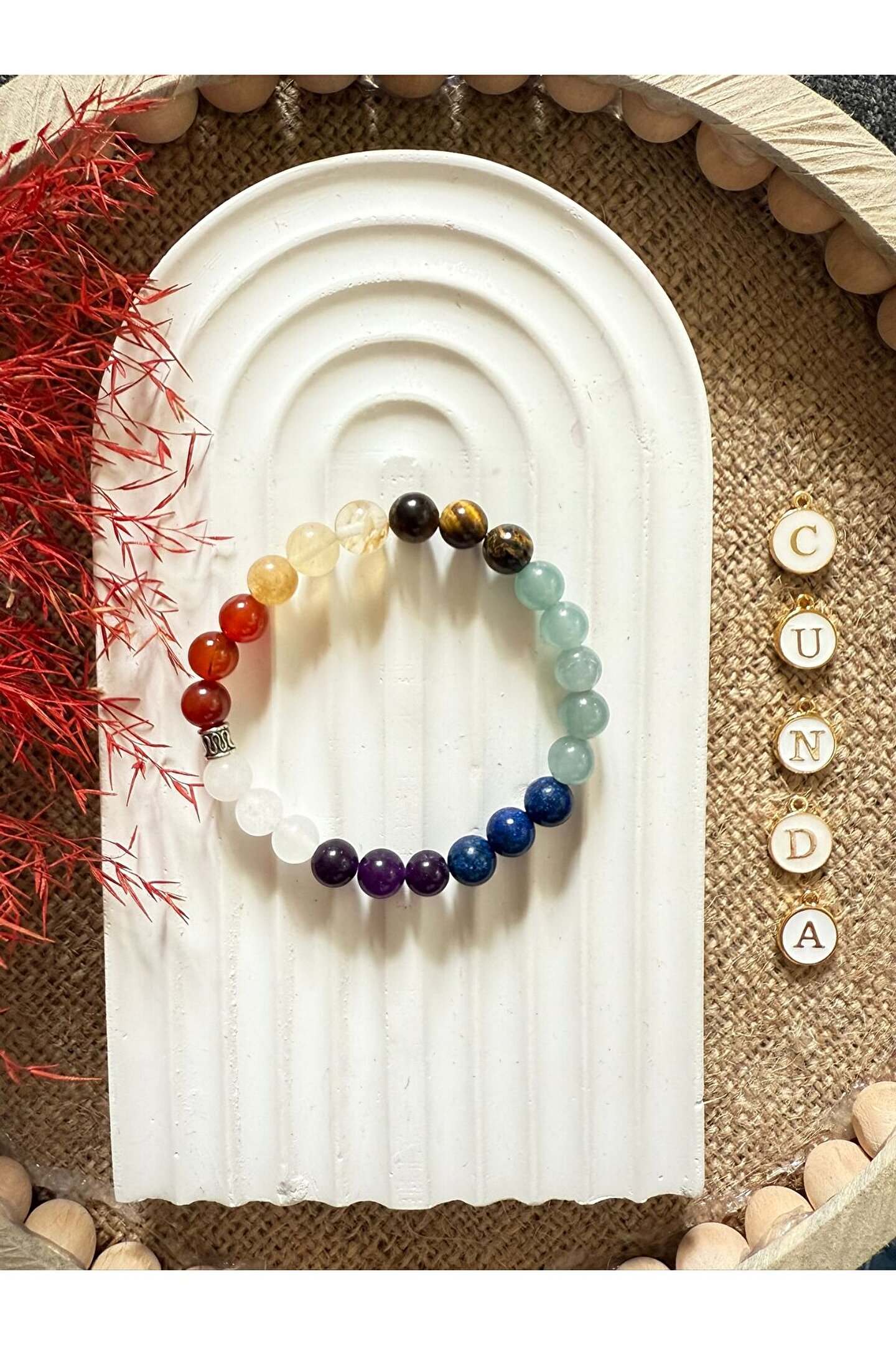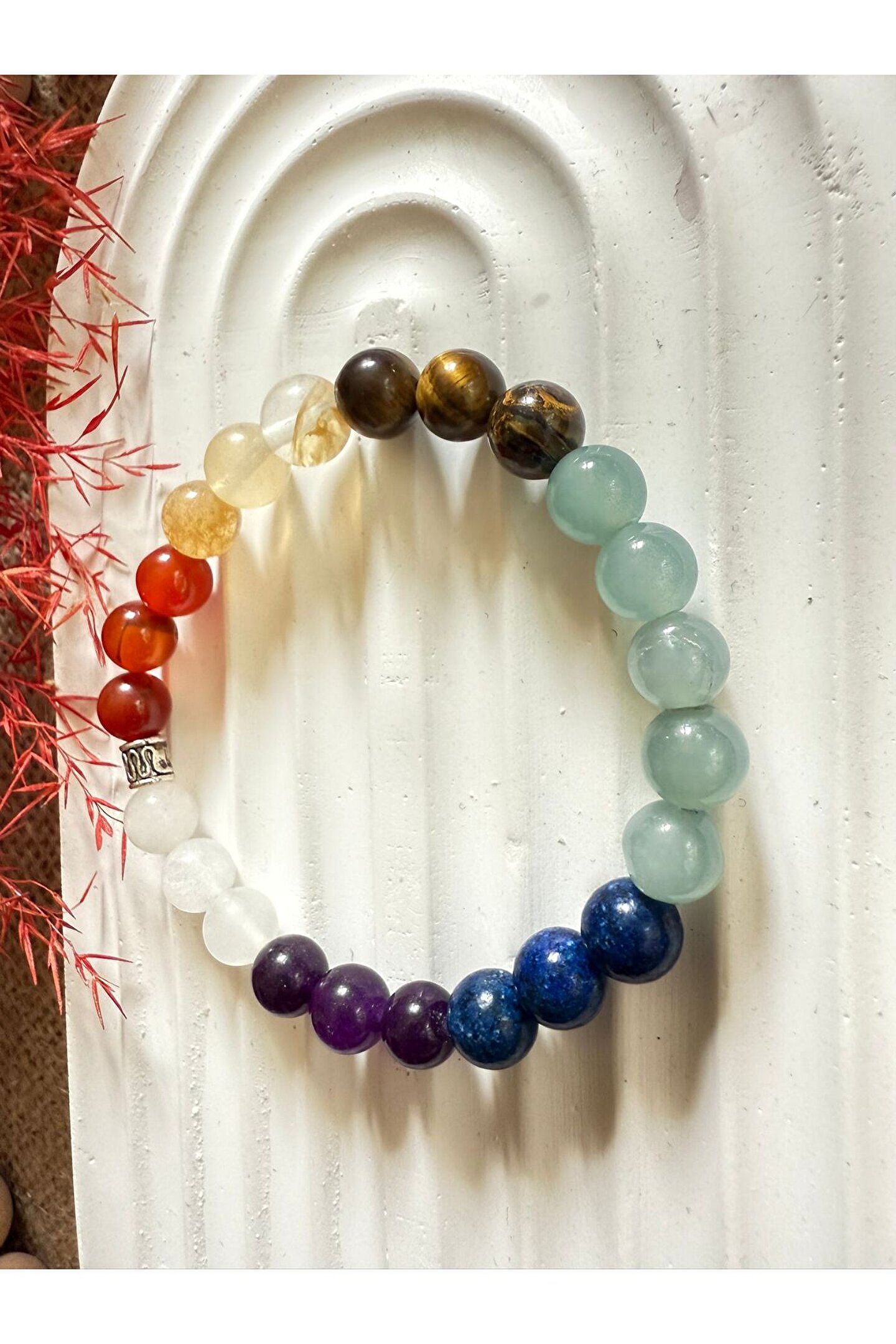 - 7 farklı doğal taşın bir arada bulunduğu bu bileklik, her bir taşın kendine özgü enerjisiyle dengeli bir enerji akışı sağlar.; - Ametist, Kaplan Gözü, Aventurin, Kristal Kuvars, Akik, Sitrin ve Lapis lazuli taşları, her birinin kendine has özellikleriyle dikkat çeker.; - Oval kesim doğal taşlar, bilekliğe zarif bir görünüm kazandırırken, aynı zamanda rahat bir kullanım sunar.; - Türkiye menşeli bu bileklik, yerel üretimle desteklenmiş ve kaliteli malzemelerle üretilmiştir.; - Kadın ve kızlar için ideal bir aksesuar olan bu bileklik, gençlerin enerjisini ve stilini yansıtır.; - Nemli bir bezle kolayca temizlenebilen bu bileklik, bakımının pratik olmasını sağlar.;
