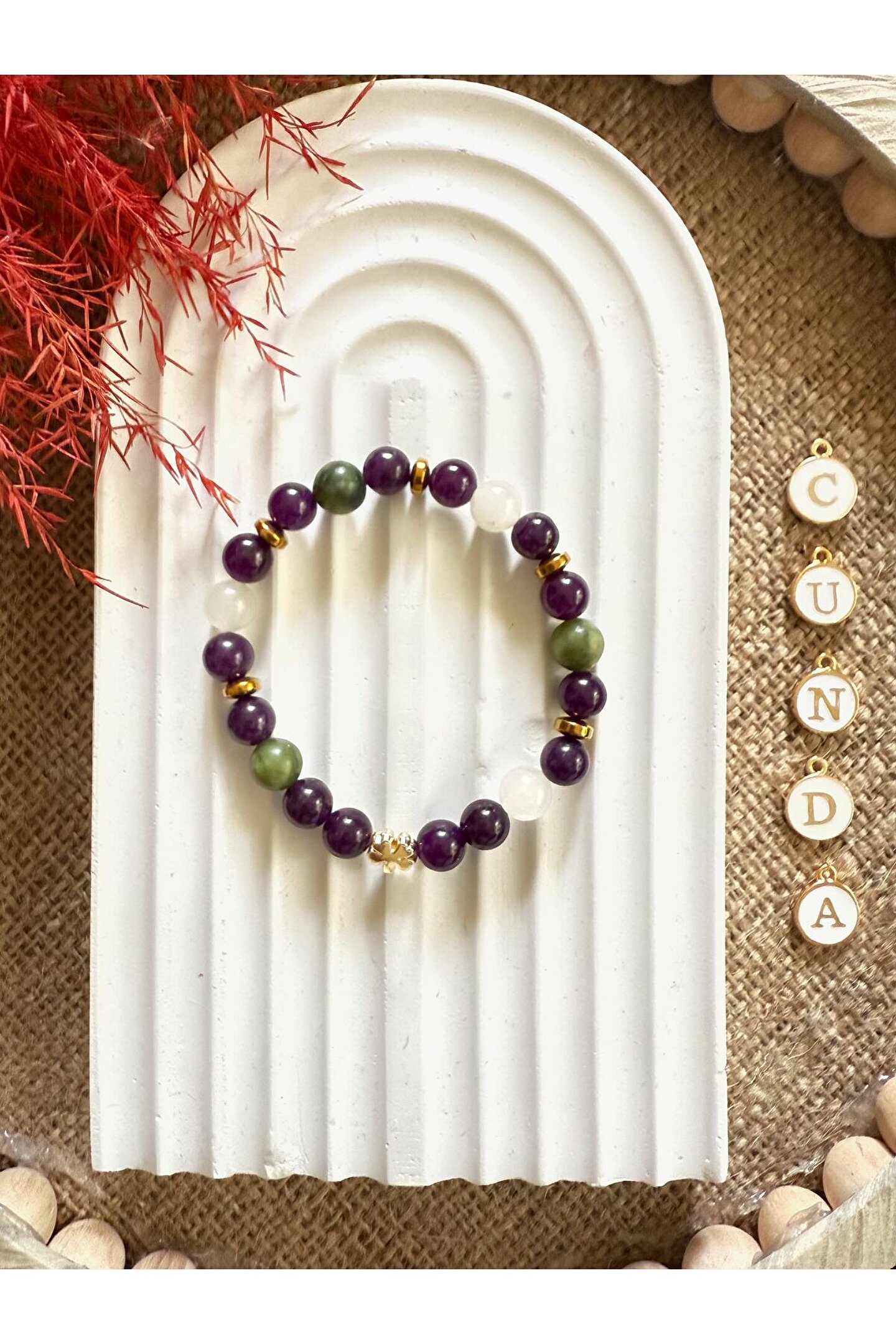 - , uyku sorunları ve gibi konularda destekleyici özelliklere sahip doğal taş bileklik.; - Oval kesim ametist, pirinç, ay taşı ve hematit taşları ile zenginleştirilmiş, her bir taşın kendine özgü enerjisiyle tasarlanmıştır.; - Ürünün materyal bileşeni hakkında detaylı bilgi verilmemiş olup, doğal taşların özgün dokusunu ön plana çıkarmaktadır.; - Bakımı kolaydır; nemli bir bezle silerek temizliği sağlanabilir.; - Türkiye'de üretilmiş olup, yerel işçilik ve malzeme kalitesiyle öne çıkmaktadır.; - Unisex tasarımıyla hem kadınlar hem de erkekler tarafından rahatlıkla kullanılabilir.; - Yetişkinler için idealdir; her yaş grubundan kullanıcıya hitap eder.;