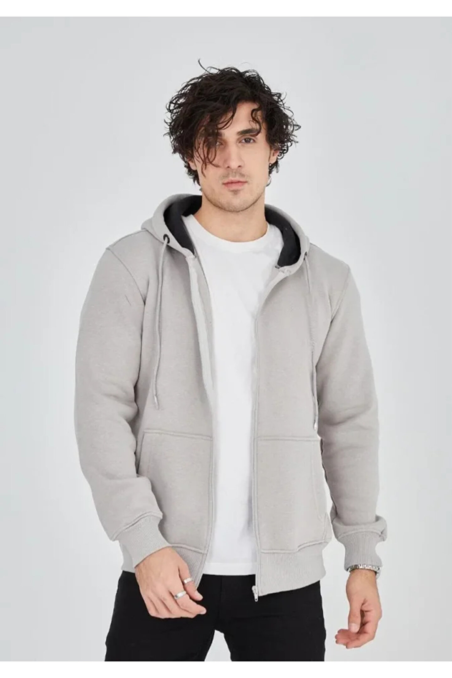 Unisex Tam Fermuarlı Kapşonlu SweatShirt - Boyalı Gri