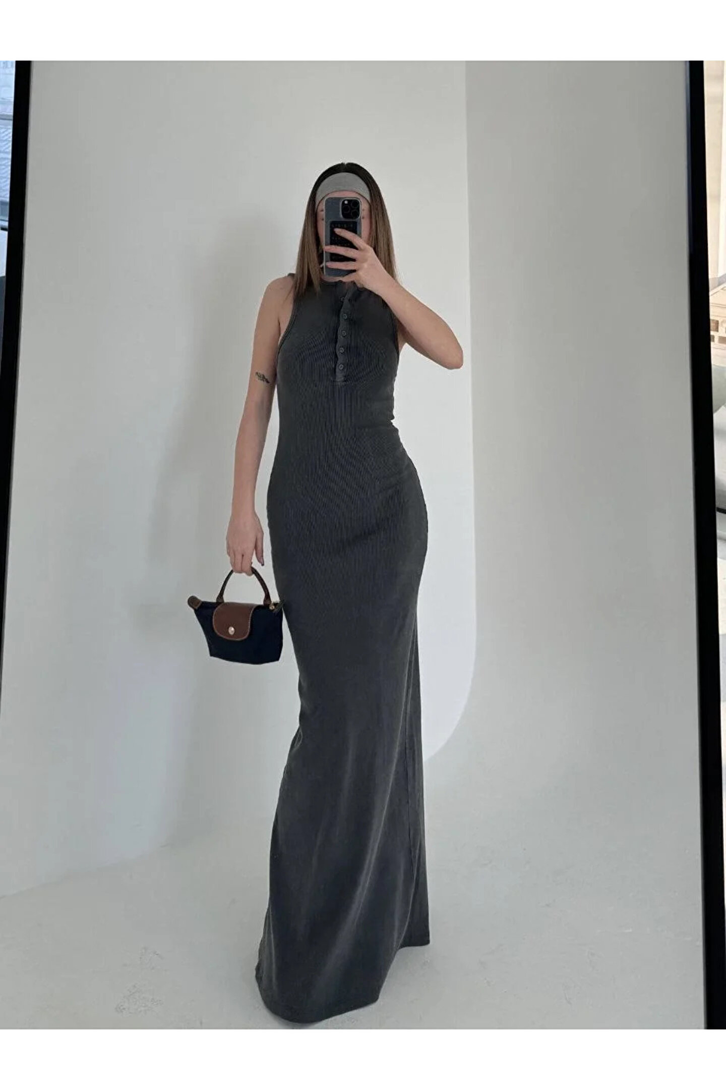 Yırtmaç Detaylı Kolsuz Düğmeli Yıkamalı Uzun Elbise - Antrasit