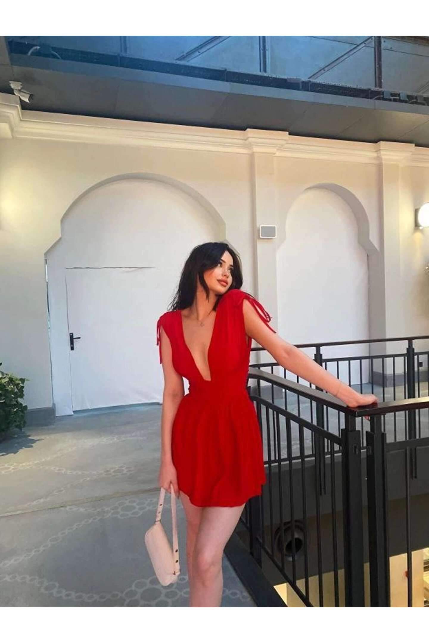 Omuzu Ip Askılı Şortlu Elbise - Kırmızı