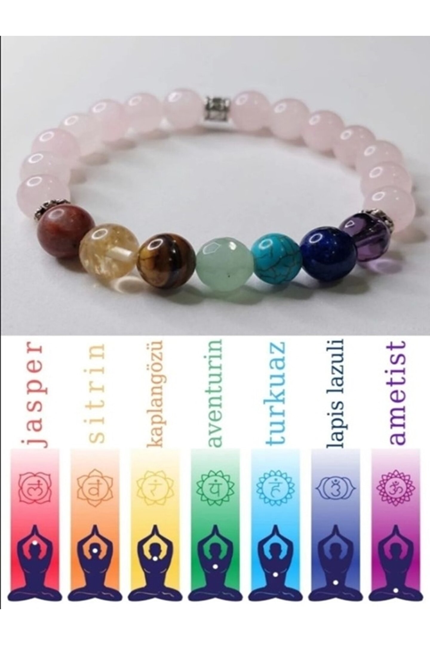 Özel tasarım 7 çakra unisex bilekliği orjinal doğal taşlardan hazırlanmaktadır. Taşların boyutu 8mm. Standart boylardadır. ; Bedenimizdeki 7 çakra da yaşam enerjimiz sürekli bir akıştadır. Çakralardaki dengesizlik, tıkanıklık, fiziksel ve ruhsal olarak hastalıklara sebep olur. Ruhsal gelişimde çakralardaki enerji akışını sağlıklı olmasıyla bağlantılıdır. Çakra taşları çakraların dengelenmesi, tıkanıklıkların açılması için gereken enerjiyi verir. Her taşın farklı frekansı vardır ve kullandığımız sürece bize gereken şifayı aktarır. ; Taşlarınızın arındırılması için haftada bir kez akan suda 5dk. Suda bekleterek, tütsüleyerek veya bir gece toprak üstünde bekleterek enerjilerini dengeleyip temizleyebilirsiniz. ;