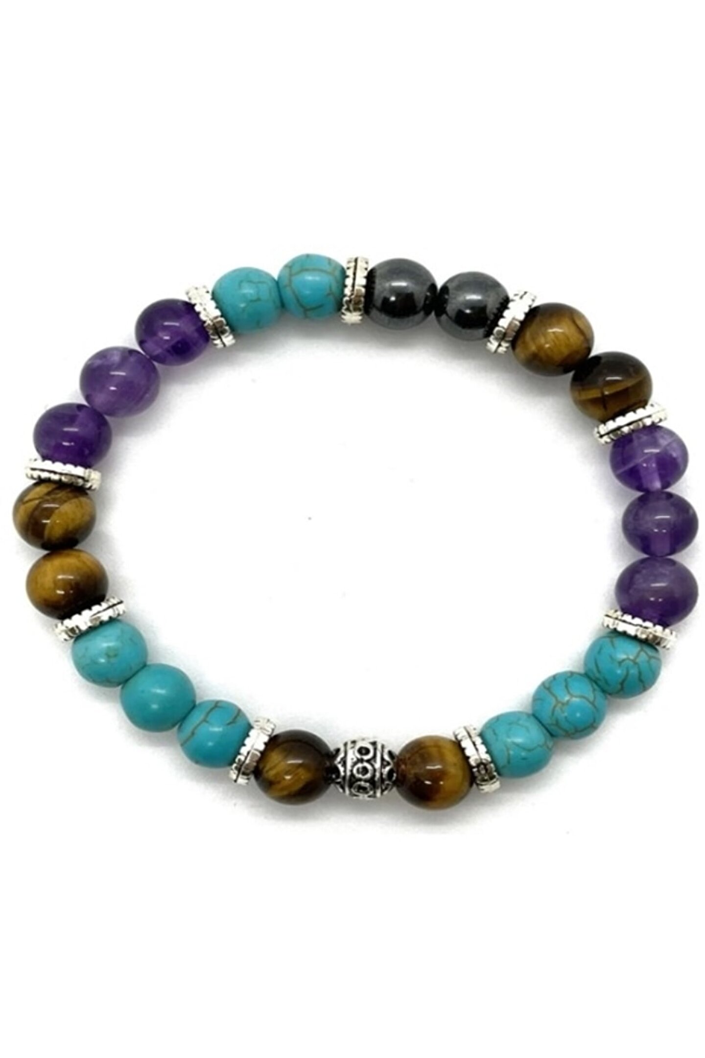 Gerçek doğal taş kullanılarak üretilmiş, şıklığı ve doğallığı bir arada sunan bileklik; Turkuaz, kaplan gözü, ametist ve hematit gibi farklı renklerdeki taşlarla zenginleştirilmiş tasarım, her zevke hitap eder; Doğal taş materyali sayesinde her bileklik benzersiz ve özgün bir görünüm kazanır; Doğal taşların eşsiz dokusu ve renkleriyle dikkat çeken bu bileklik, günlük kullanım için idealdir;