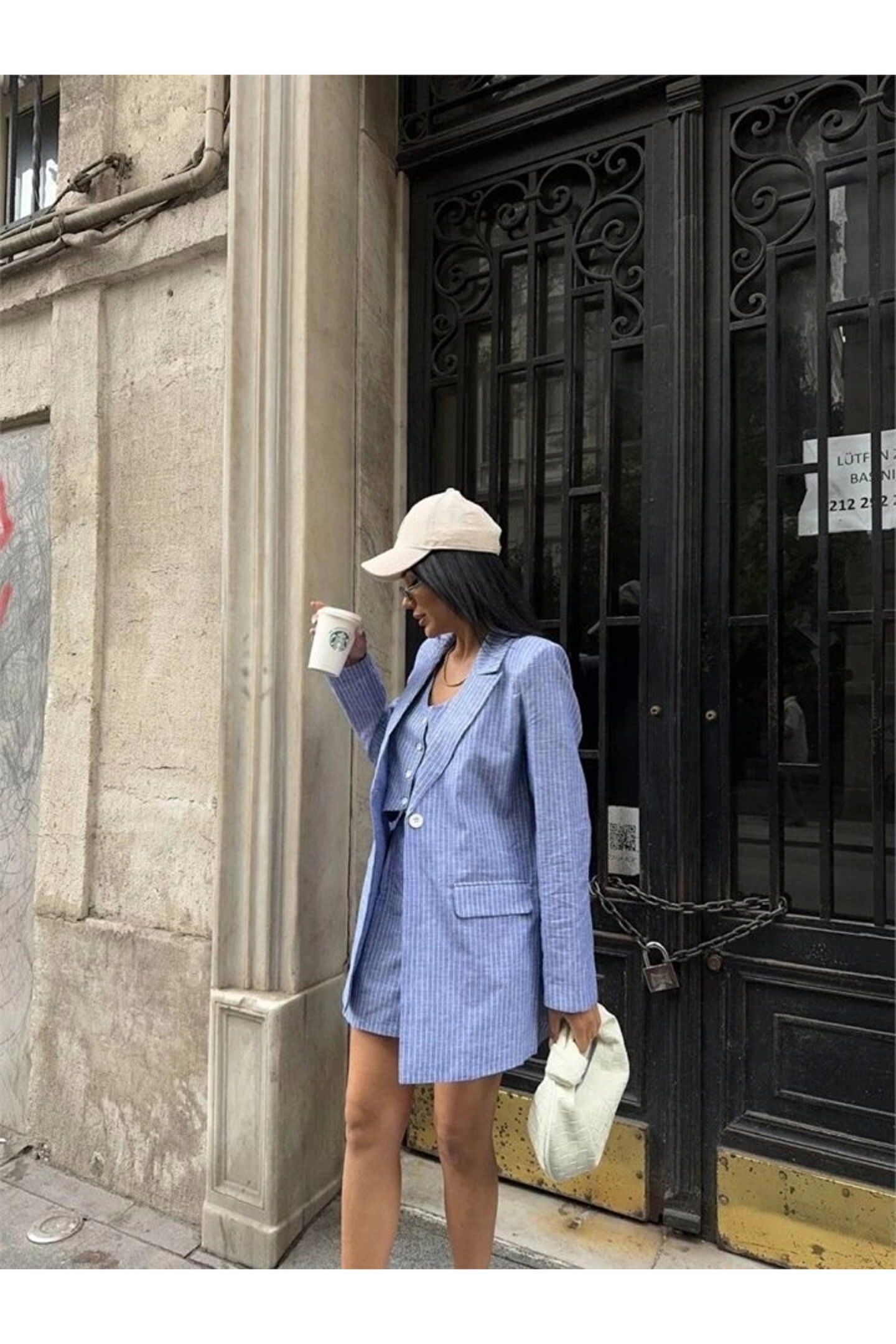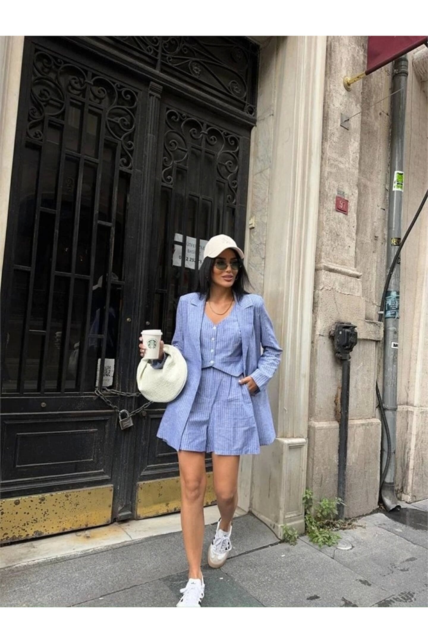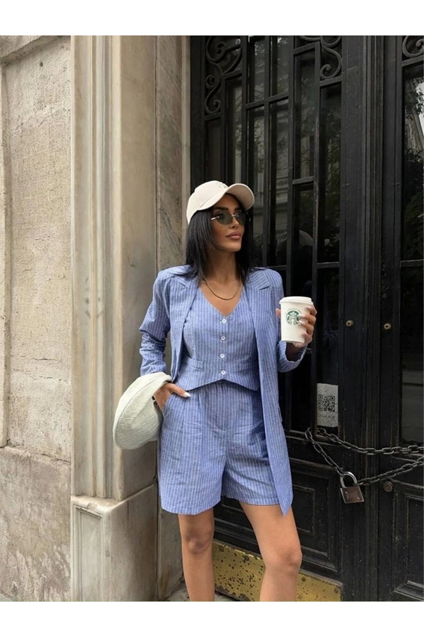 ÇİZGİLİ KETEN CEKET YELEK ŞORT TK - Mavi
