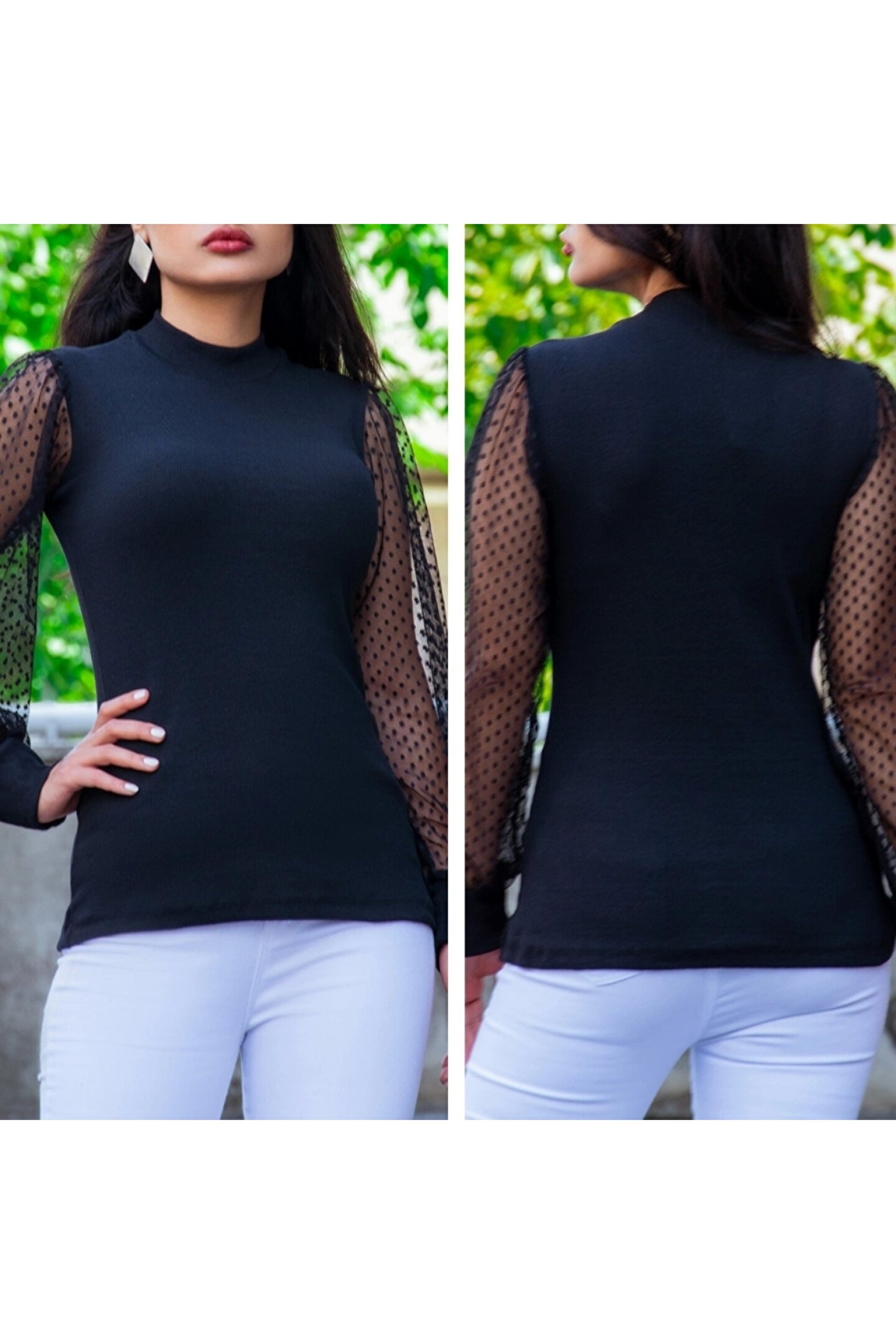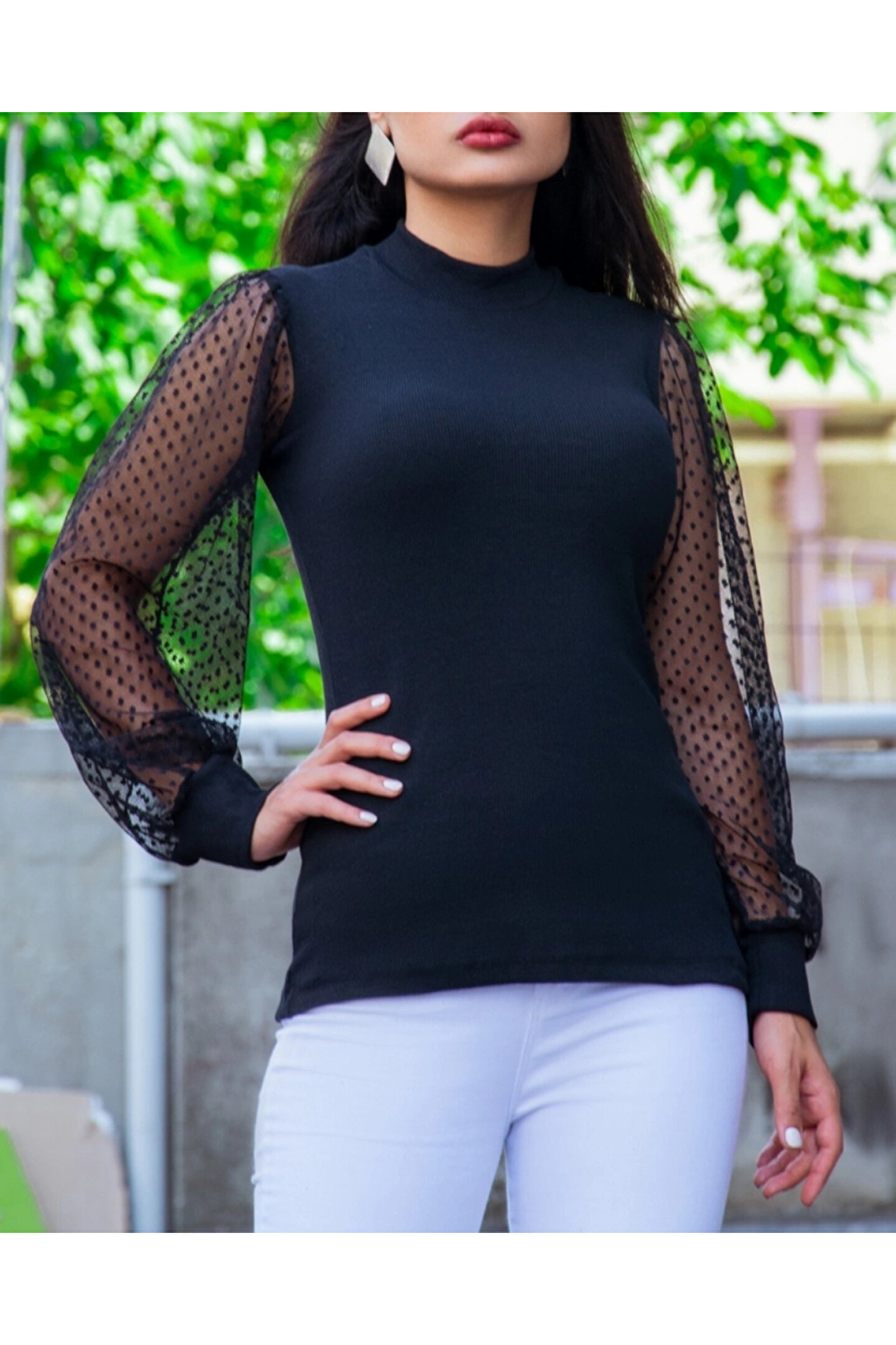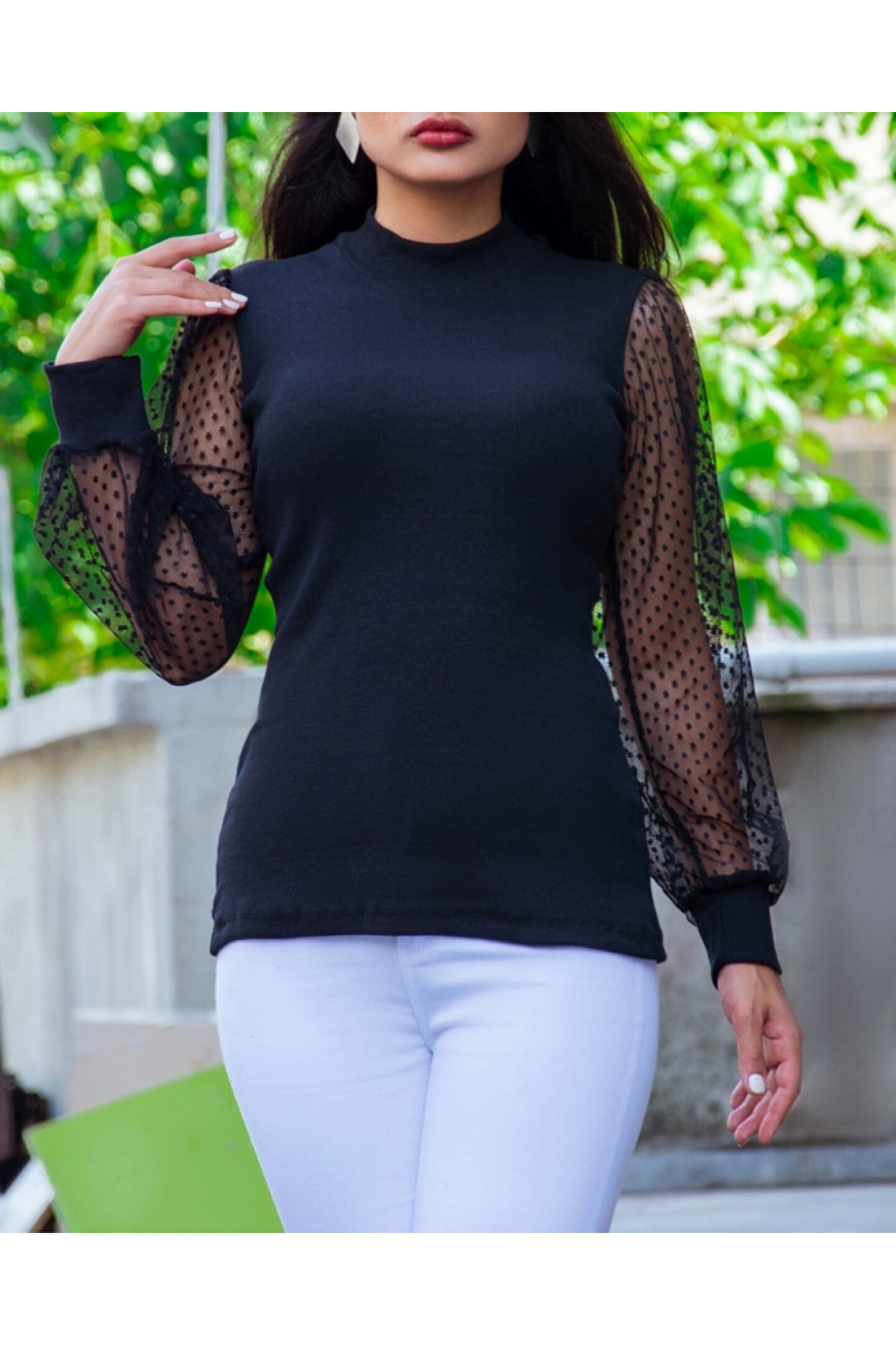 Kadın Siyah Kolu Tül Detaylı Yarım Balıkçı Kaşkorse Bluz