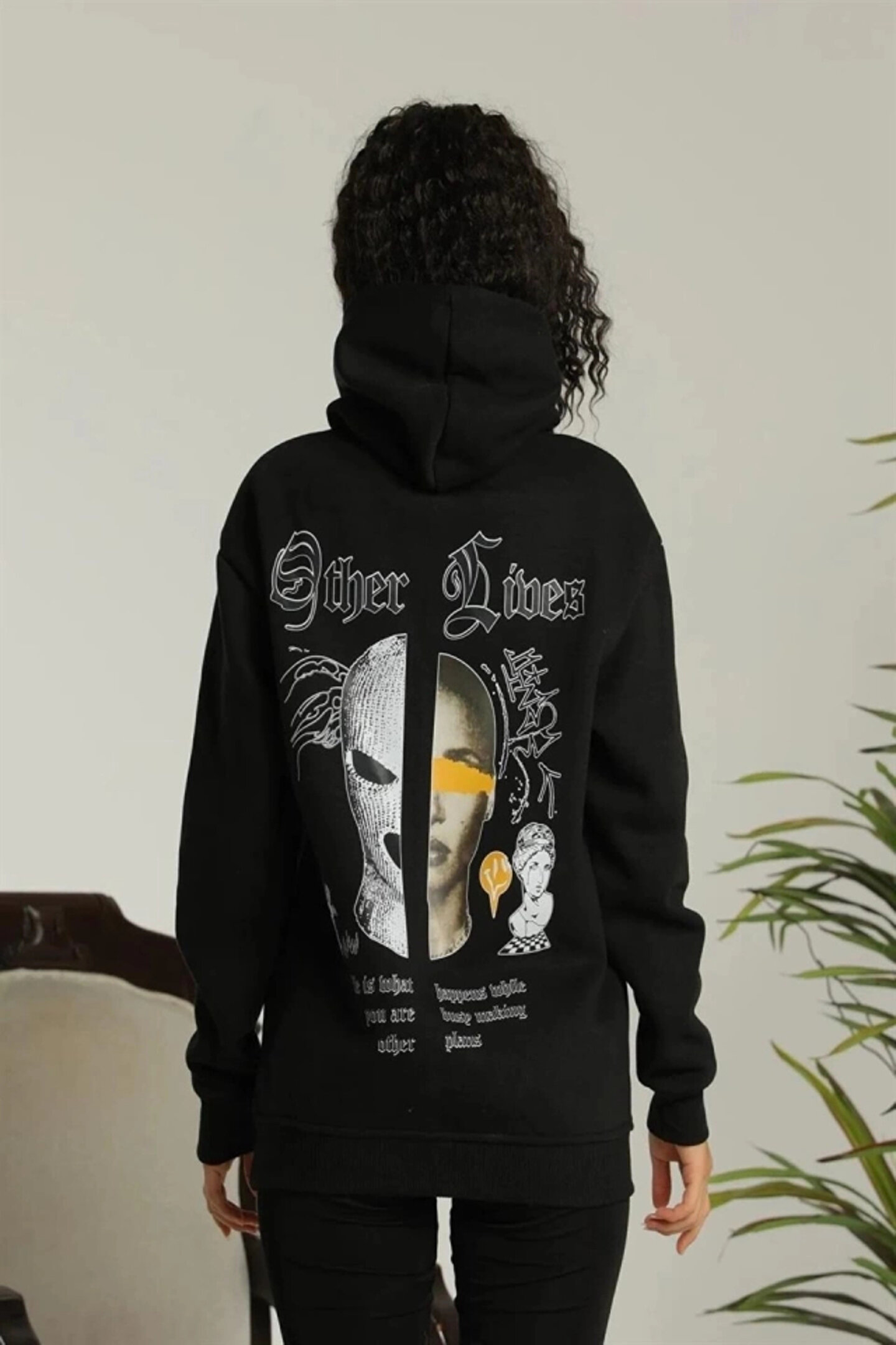 Oversize Üç İplik Kapüşonlu Sweatshirt – Siyah “Other Lives” Ön Ve Arka Baskılı, Şardonlu Kışlık, Rahat Günlük Model Siiyah
