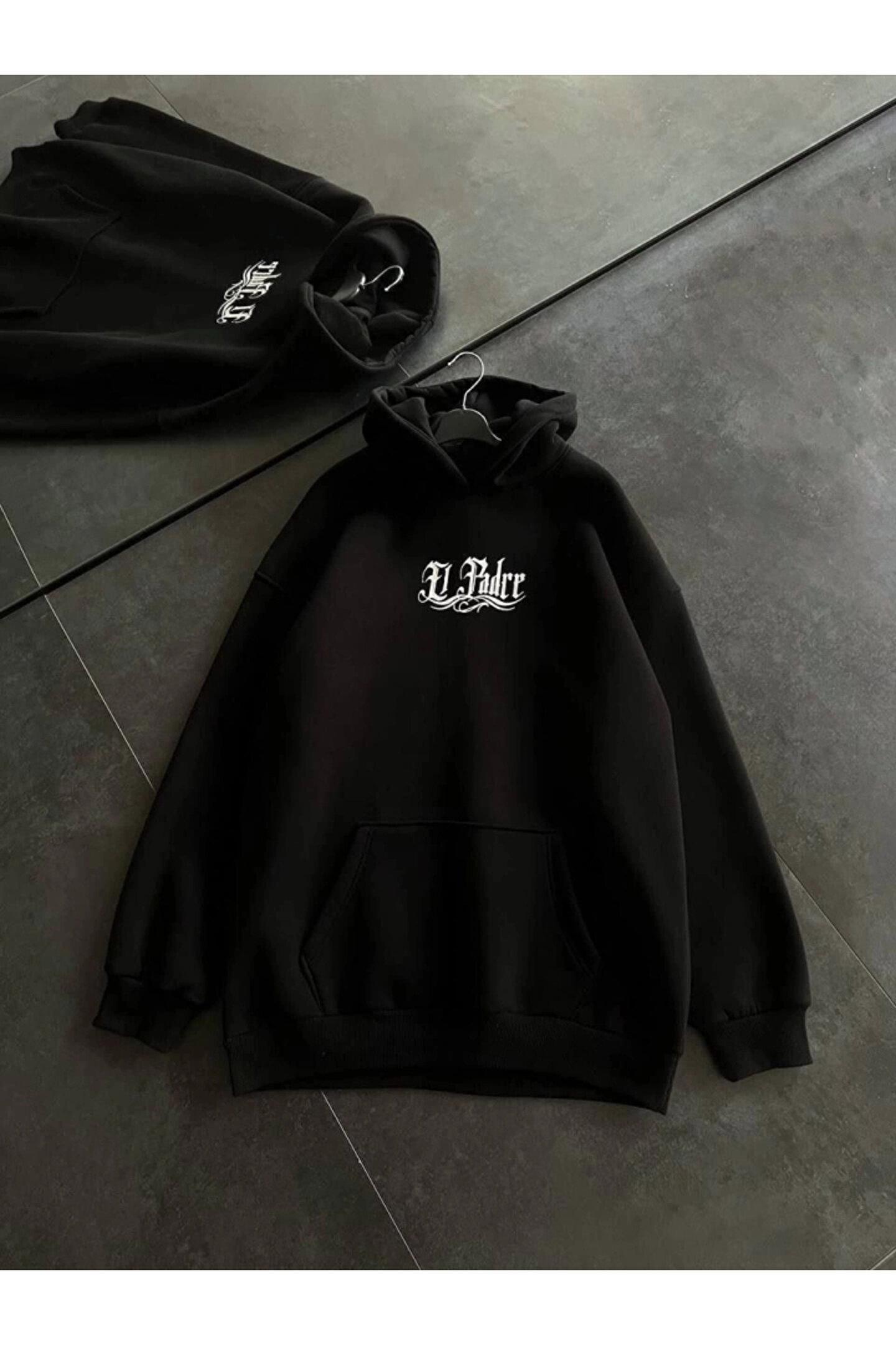 Üç İplik Penye Uzun Kol Kapşonlu Baskılı SweatShirt - Siyah