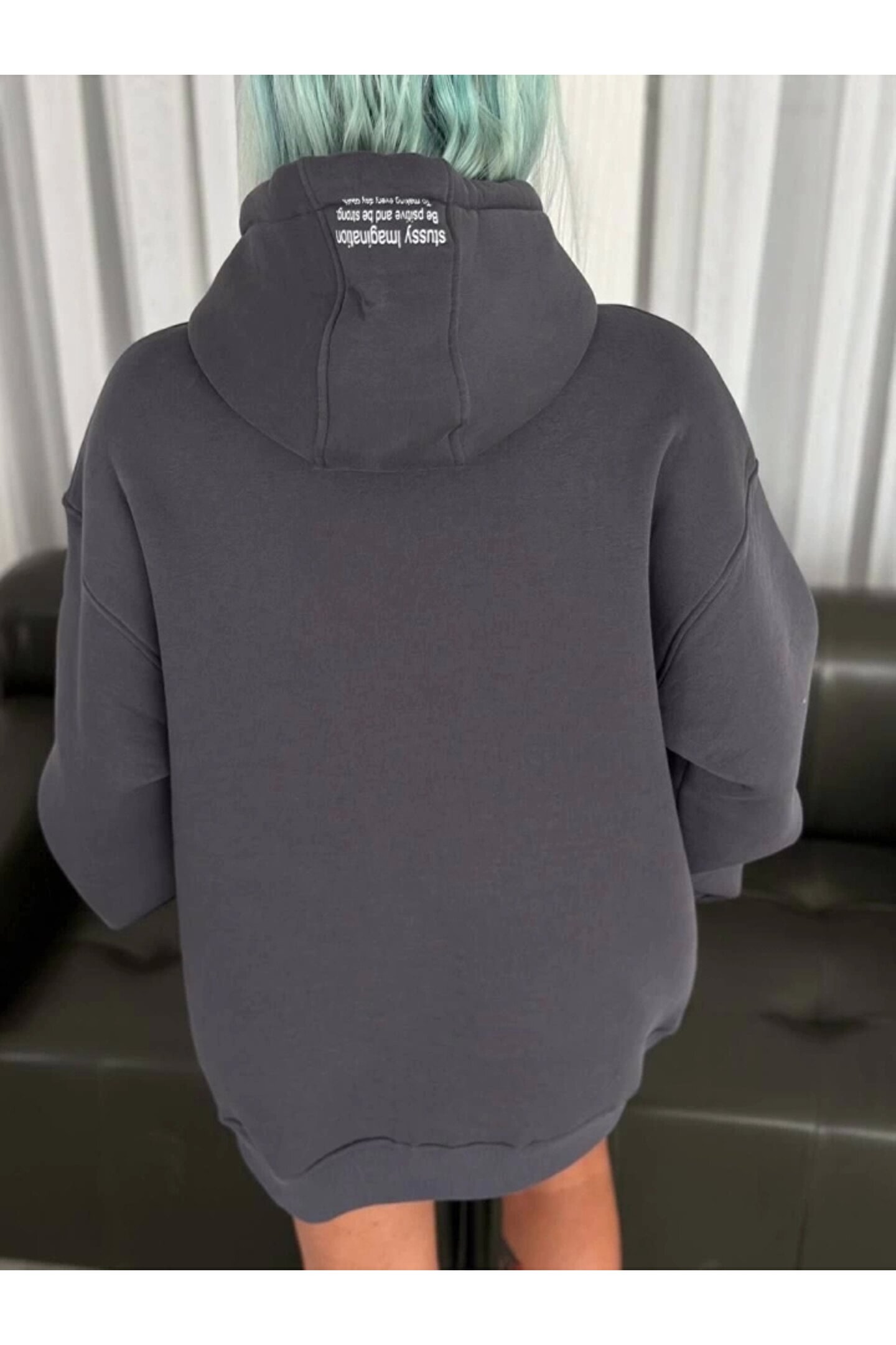 Üç İplik Kapşonlu Baskılı SweatShirt - Füme