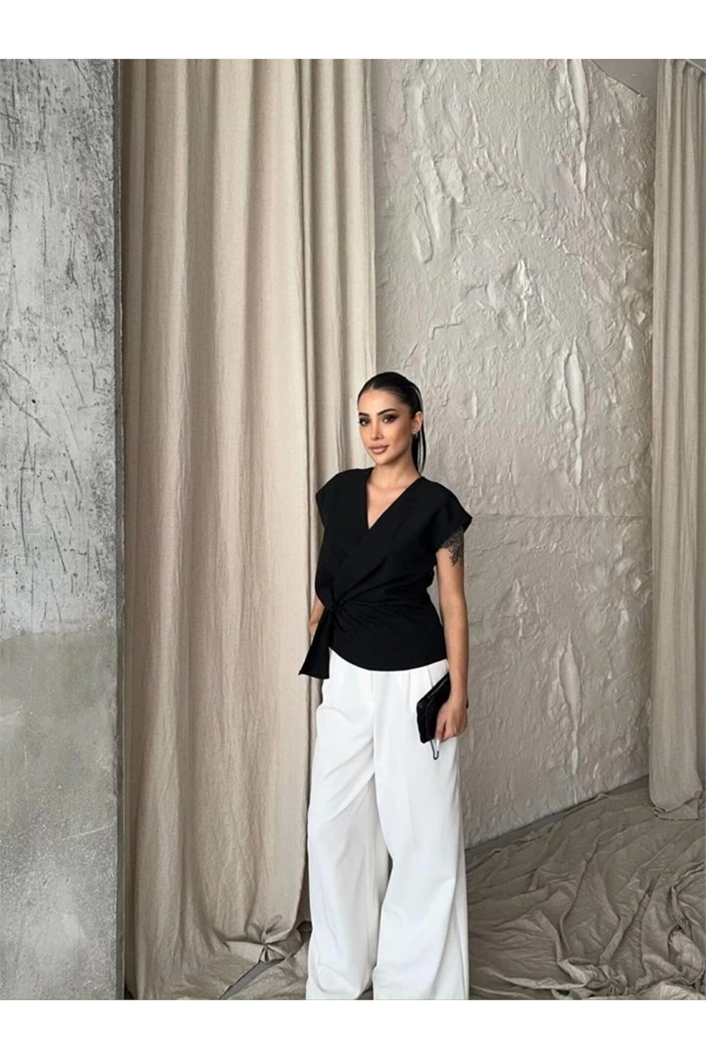 YANDAN BAĞLAMA DETAYLI KOLSUZ BLUZ - Siyah