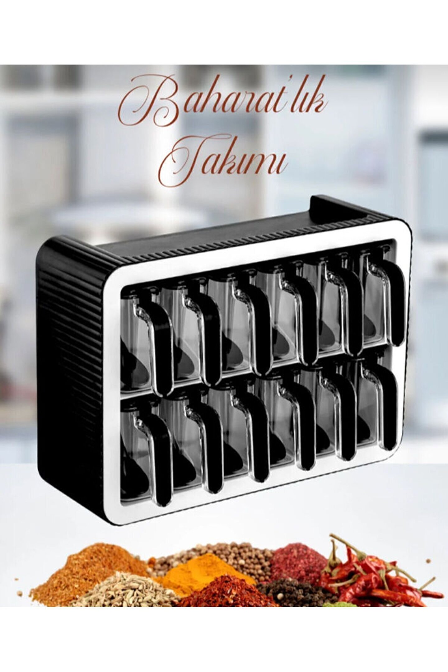 Standlı 12 Li Kendinden Yapışkanlı Kaşıklı Kapaklı Baharatlık Takımı - Siyah Beyaz