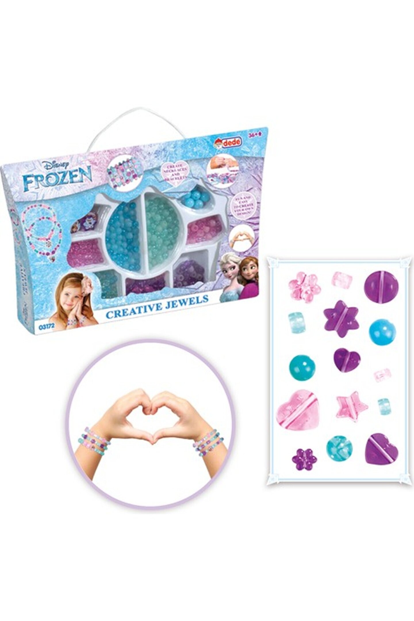 Frozen Takı Seti Küçük El Çantası Renk renk boncuklarla, kendi takını tasarla! Kolyeni ve bilekliğini oluştur! Boncuklar küçük eller için, dikkat edilerek tasarlanmıştır.; Küçük parçalar, 3 yaş altı çocuklar için uygun değildir.; Sağlık testlerinden geçmiştir.; Yerli üretimdir.