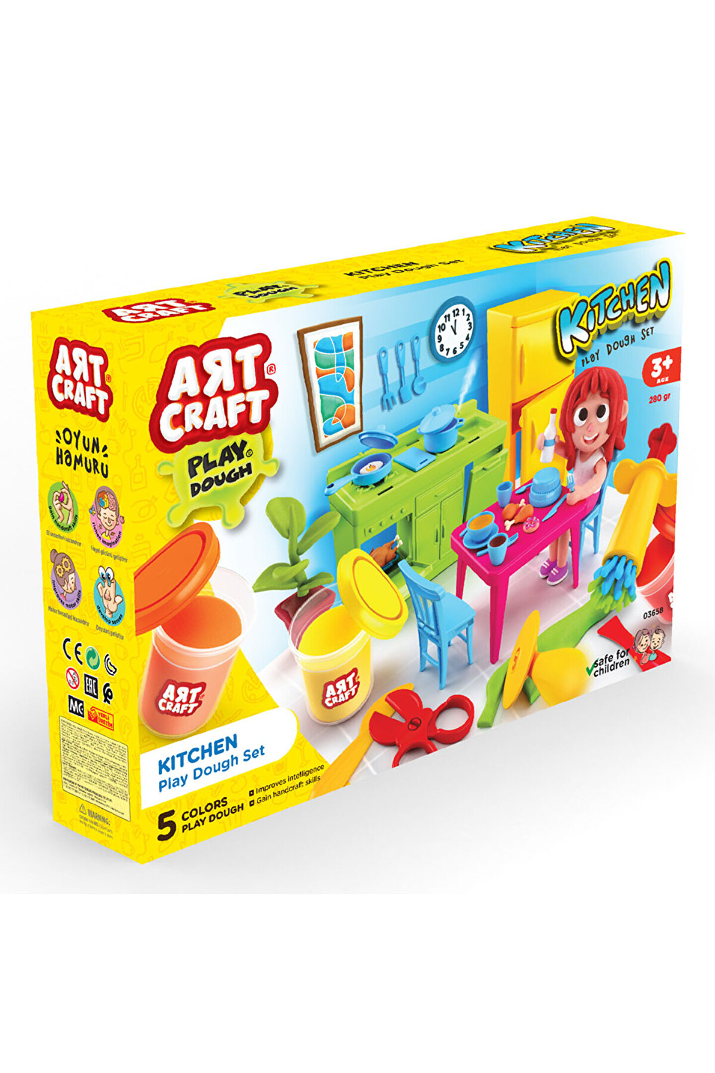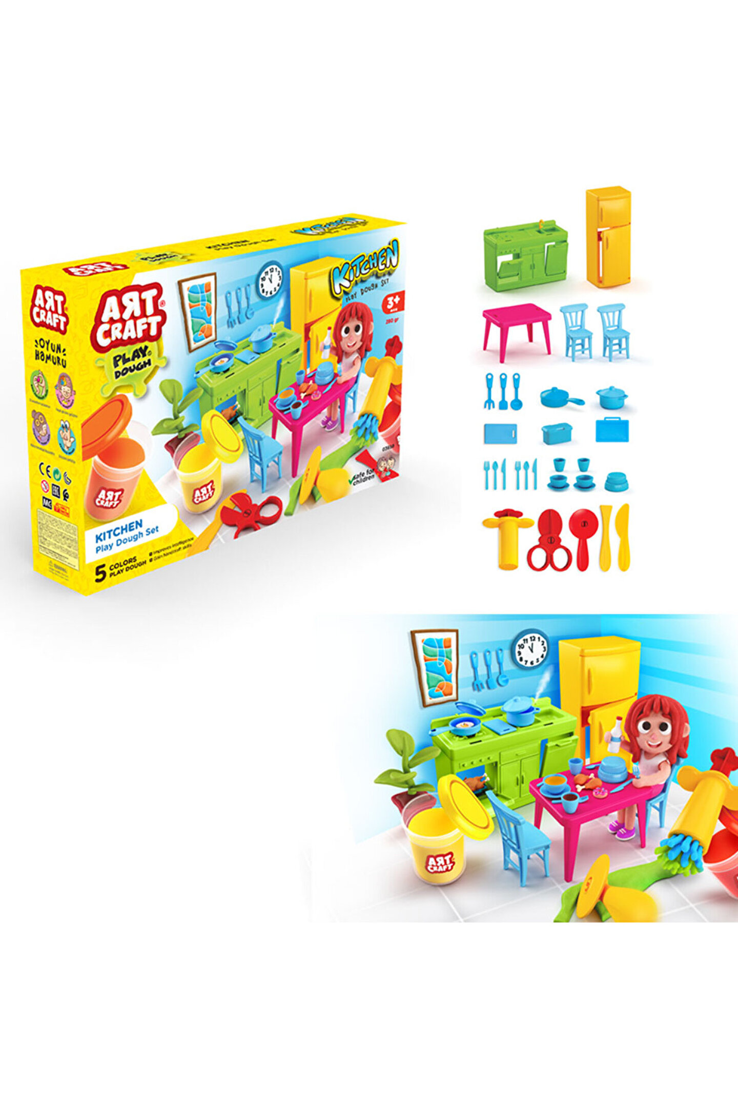 Ürün; 5 renk oyun hamuru ve birçok aksesuar içermektedir.; El becerileri kazandırır.; Hayal gücünü zenginleştirir.; Duyuları geliştirir.; Öğrenmeyi pekiştirir.; Ürün; 3 yaş altı çocuklar için uygun değildir.; Sağlık testlerinden geçmiştir.; Yerli üretimdir.; Kutu ölçüsü: 37.5x26x7.5 cm
