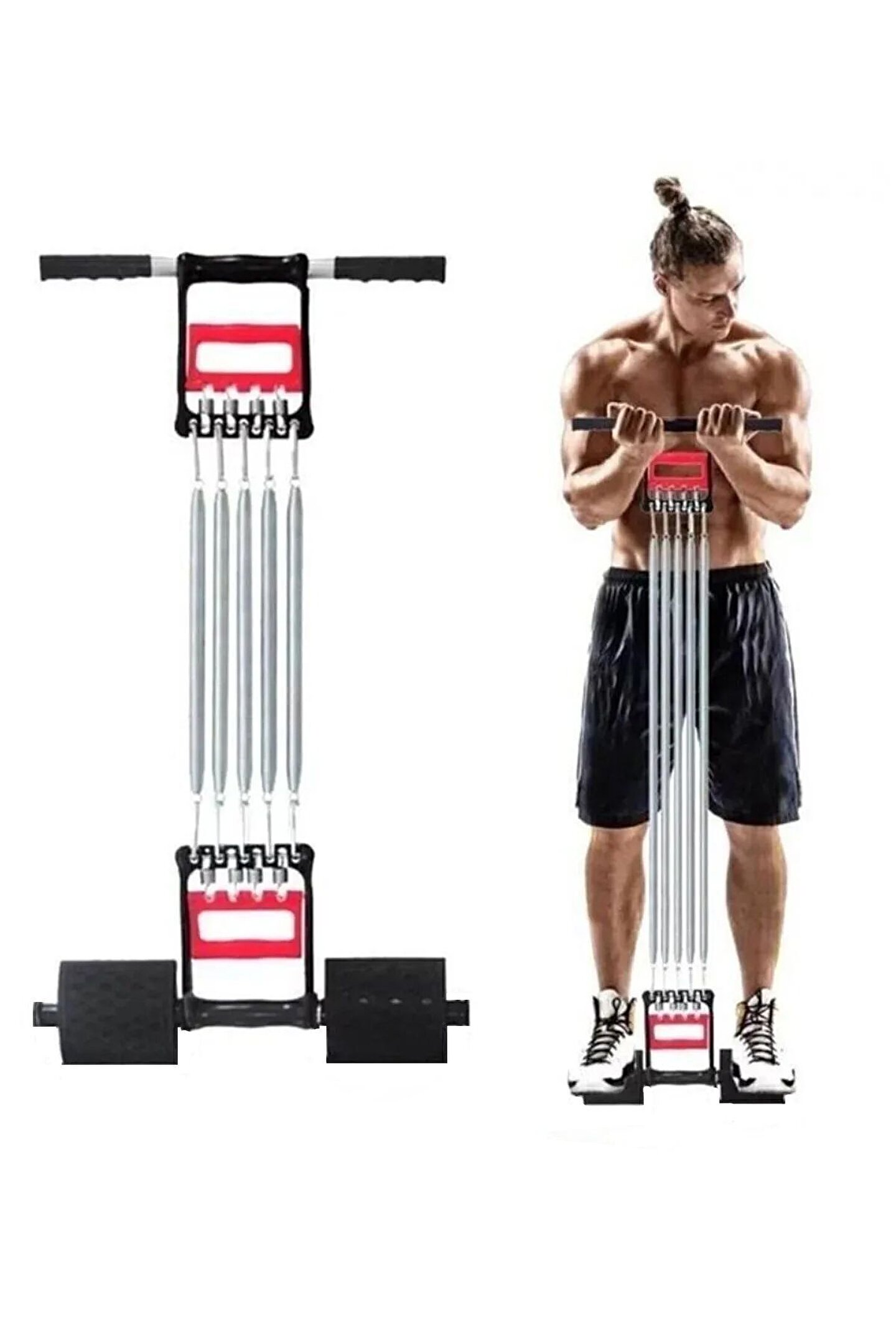 1 adet Göğüs yayı 5 çelik yaylı 66cm + el yayı fonksiyonlu + ayak yayı fonksiyonlu İsteğe göre göğüs yayları azaltılabilir veya azami sertlik olan 5 yayla çalışılabilir.; Aynı şekilde el yayları da azaltılıp arttırılabilir.; Renkli kutuda Kutu ebatları : 34cm x 15cm x 8cm