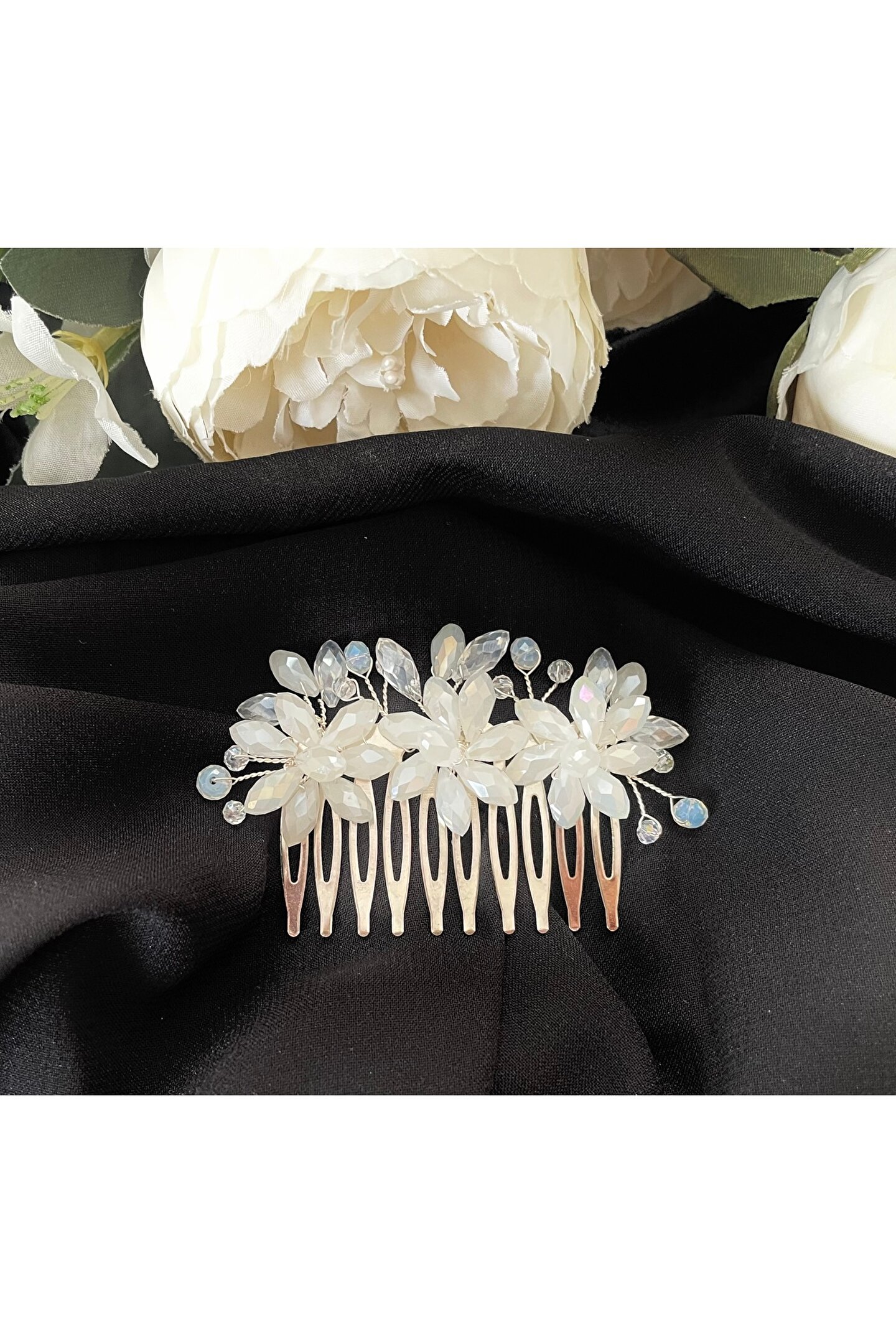 Kristal taş detaylarıyla süslenmiş, zarif tasarımıyla göz alıcı bir görünüm sunar; Beyaz damla taş kullanımı, taç aksesuarına sofistike bir parlaklık katar; Nişan ve gelinlik gibi özel günlerde şıklığınızı tamamlayacak ideal bir aksesuardır; Taraklı yapısı sayesinde saçınıza kolayca takılabilir ve sabit kalır;