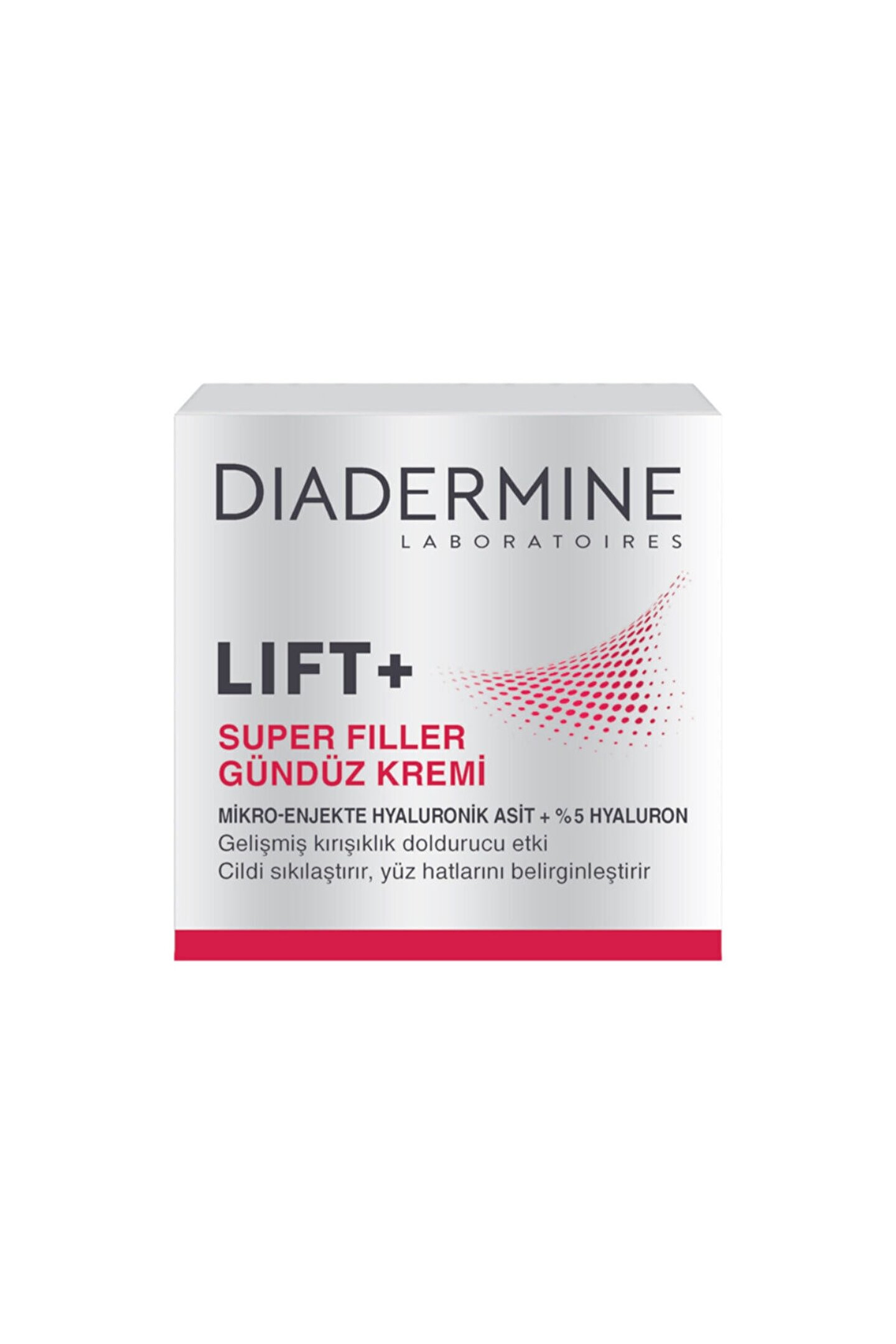Diadermine Lift+ Superfiller Gündüz Kremi Diadermine Lift+ Superfiller Gündüz Kremi, 2 güçlü yaşlanma karşıtı etkiyi bir araya getirir. ; Pro-kolajen içeren güçlü formülü kolajen üretimini desteklemek ve daha sıkı bir cilt oluşturmak için en önemli kolajenlerin yoğunluğunu arttırmaya yardımcı olur. ; Cilt Tipleri: Normal- Kuru/Hassas Ciltler için. ; İçerik: Mikro-enjekte Hyaluronik Asit + % 5 Hyaluron. ; Dokusu: İpeksi, Yoğun, Besleyici. ; Önerilen Yaş Grubu: 30 - 35 - 40 - 45 - 50 Diadermine Lift+ Superfiller Gündüz Kremi ürününü Migros Sanal Market'in Günlük Bakım Kremleri Reyonundan satın alabilir, tek tıkla online sipariş verebilir, ödemeyi online olarak ya da kapıda kredi kartı ile gerçekleştirebilir, aynı gün içerisinde teslim alabilirsiniz.Net Miktar (g/ml)50MenşeiSLOVENYAGıda İşletmecisi / Üretici / İthalatçı / DağıtıcıTÜRK HENKEL KİMYA SAN.VE TİC.A.Ş.Ürün Bilgilerini Kullanma Hakkındaİnternet sitemizde ve online satış kanallarımızda yer alan ürün etiket bilgileri, ürünün tedarikçisi tarafından Migros Ticaret A.Ş. ; ye iletilen en güncel bilgilerdir. ; Ürün etiket bilgileri ile internet sitemiz ve online satış kanallarımızda bulunan bilgiler arasında herhangi bir farklılık bulunması halinde sorumluluk tamamen tedarikçi firmaya aittir.;