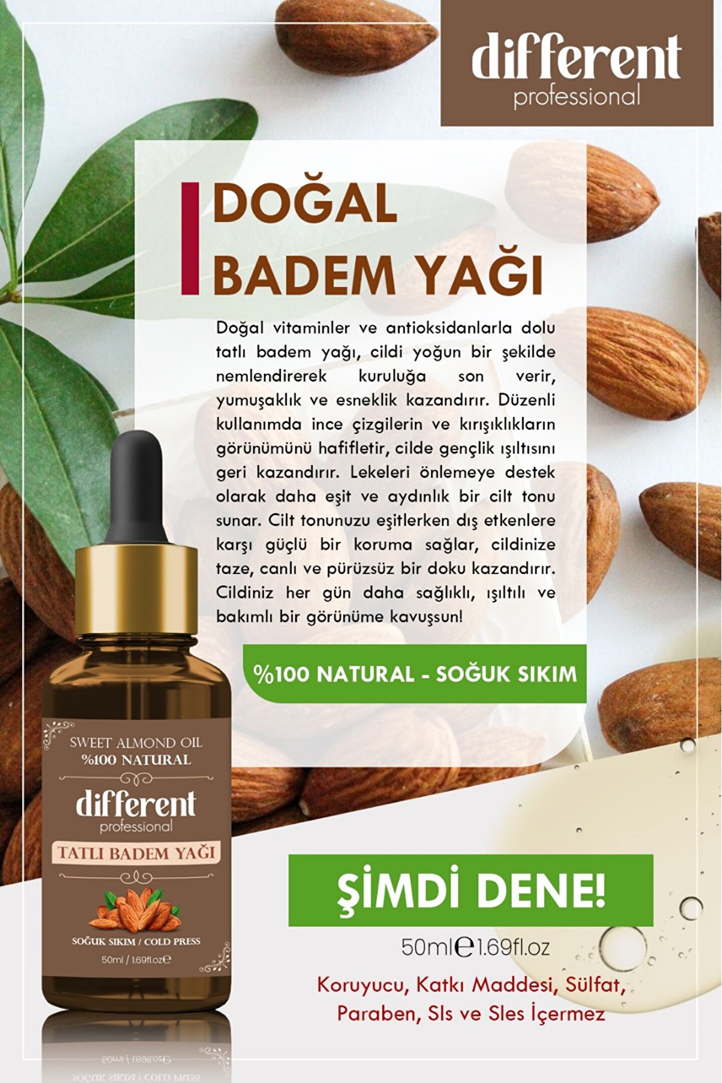 Doğal tatlı badem yağı, soğuk pres yöntemiyle üretilerek maksimum besin değerini korur.