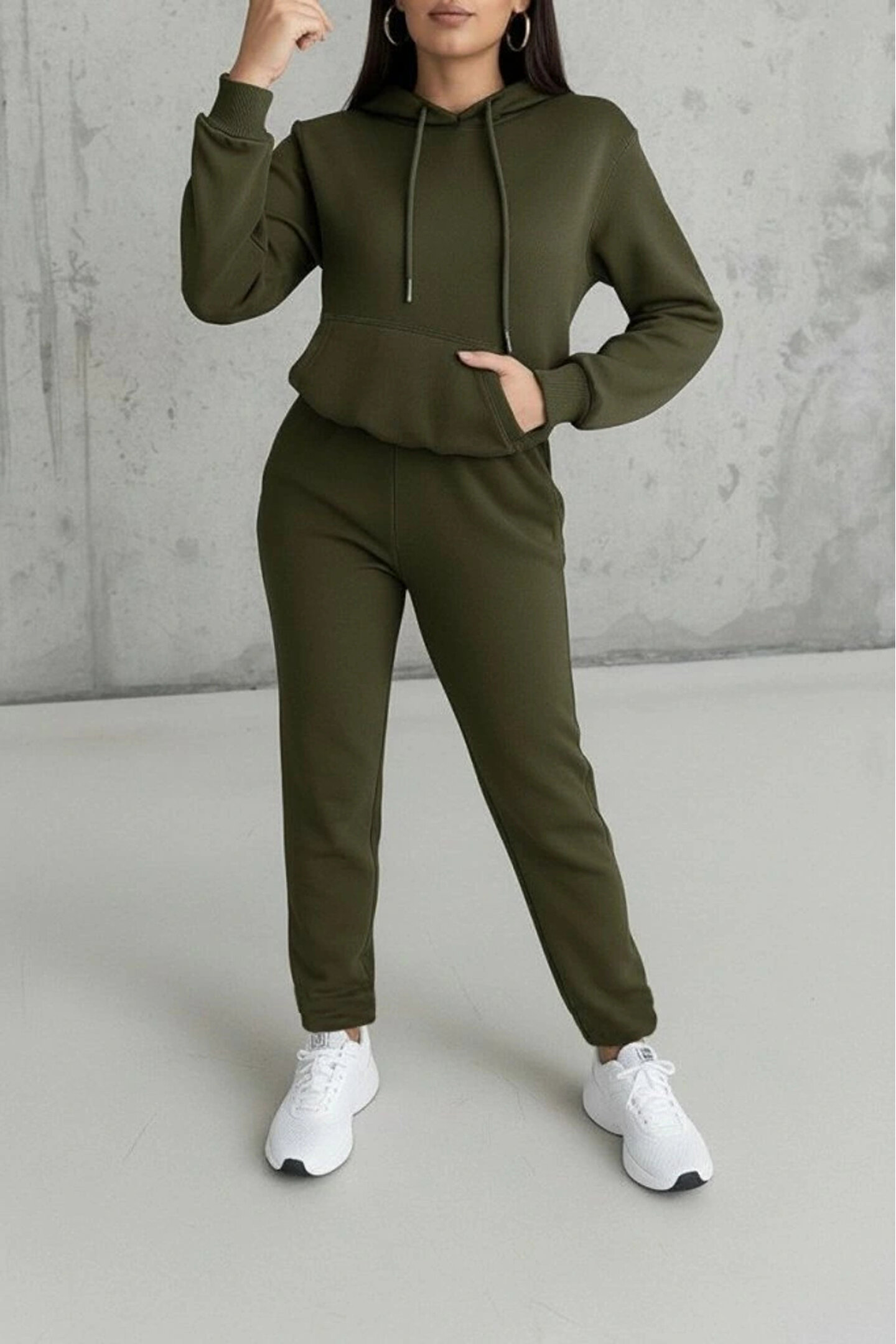Kadın Uzun Kollu Kapşonlu Bağcıklı üç Iplik Bluz Ve Pantolon Ikili Takım