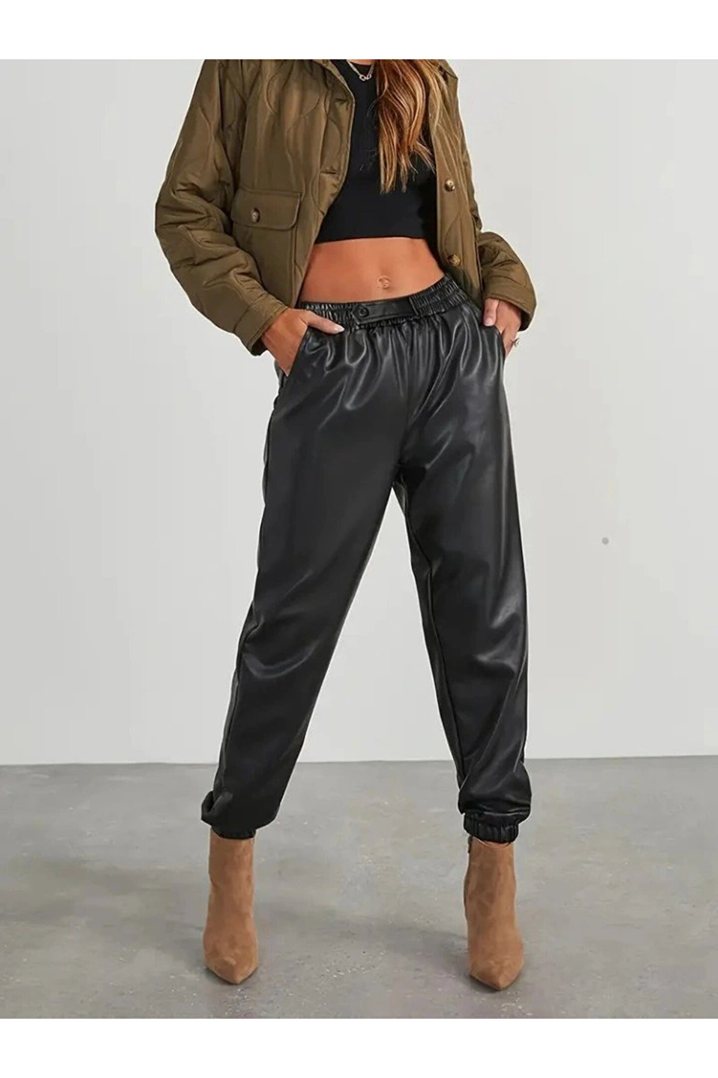 Kadın Yüksek Bel Lastikli önü Düğmeli Deri Pantolon