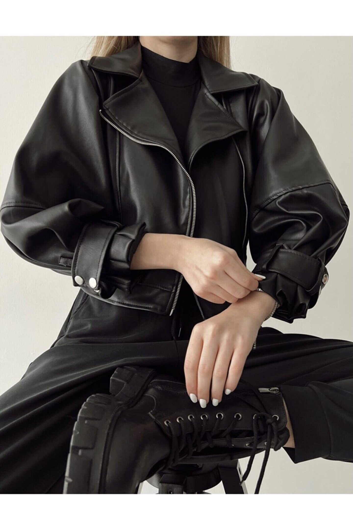 Biker tarzı tasarımıyla dikkat çeken bu ceket, düz silueti ve balon kollarıyla modern bir görünüm sunar; Çift cepli yapısı, günlük kullanım için pratiklik ve fonksiyonellik sağlar; Orta kalınlıkta suni deri kumaşı, mevsim geçişlerinde ideal bir konfor ve şıklık sunar; Her yaş grubuna hitap eden bu ceket, gençlerden yetişkinlere kadar geniş bir kullanıcı yelpazesine sahiptir; Düz deseni ve uzun kol boyu ile sade ve zamansız bir stil oluştururken, fermuarlı kapama şekli kolay kullanım imkanı tanır; Uzun boy tasarımı sayesinde rahat hareket etme özgürlüğü sağlar ve orta boy kesimiyle vücut hatlarını nazikçe sarar;