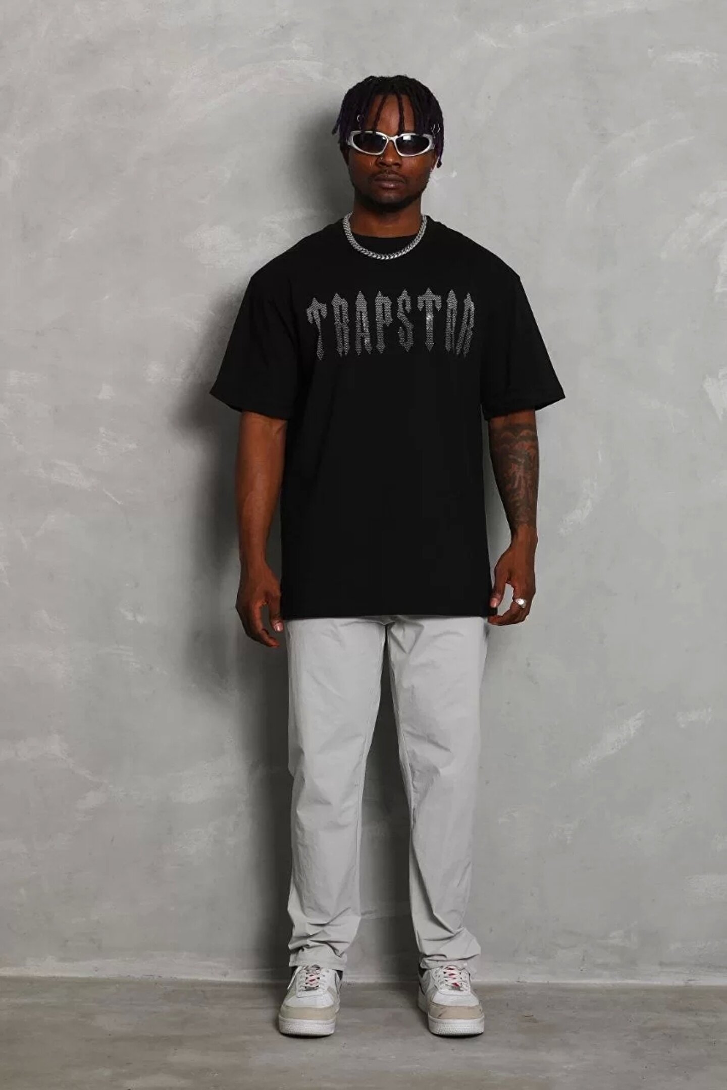 Unisex Oversize Taşlı Bisiklet Yaka T-Shirt - Siyah