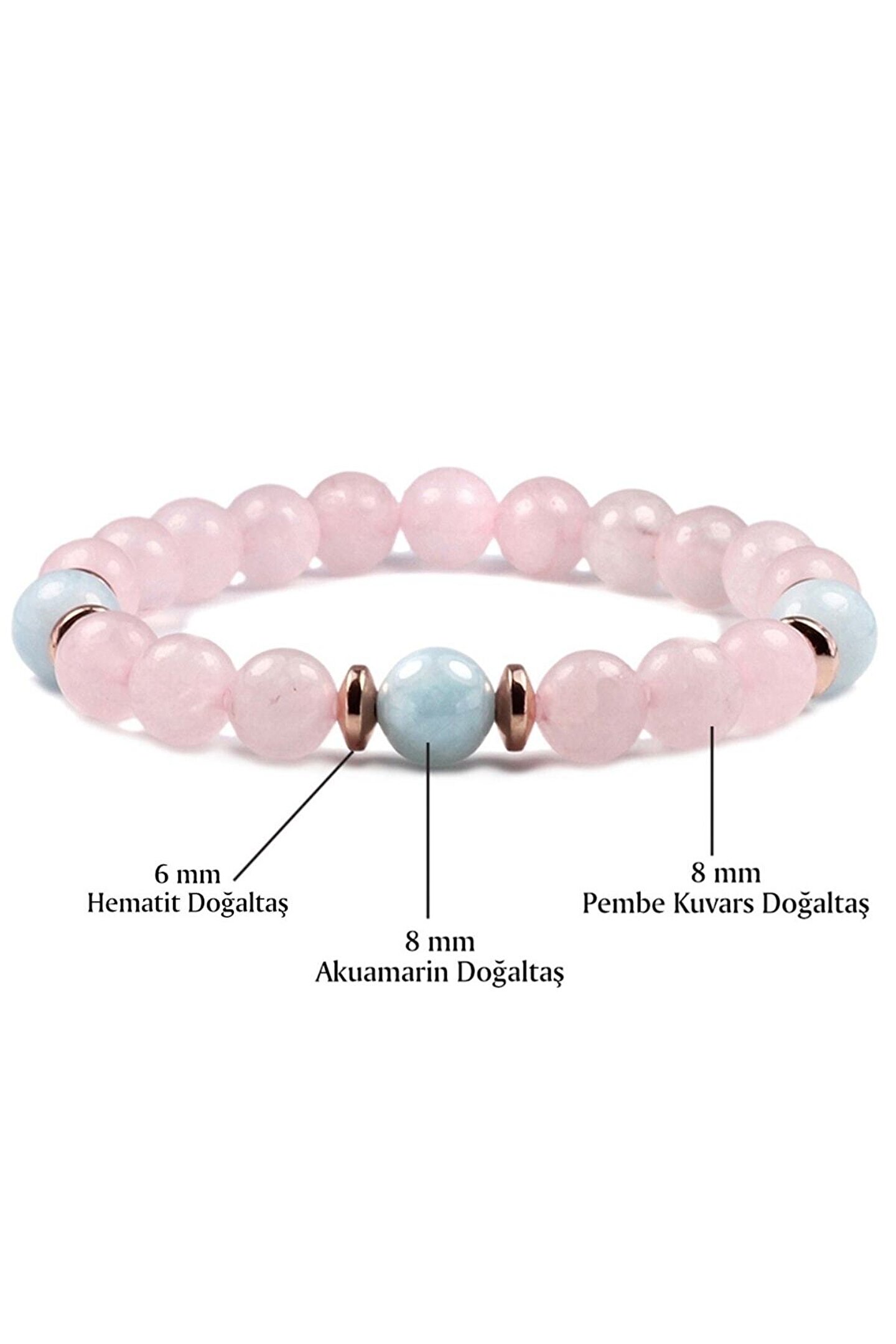 Sertifikalı Akuamarin - Pembe Kuvars Doğal Taş Bileklik 8 mm Akuamarin taşı, dünyadaki birçok yerde çıkarılmaktadır.; ; En büyük akuamarin madenleri Brezilya, Rusya, Madagaskar, Zambiya, Tanzanya, Pakistan, Nijerya, Hindistan ve ABD'de bulunmaktadır.; ; Türkiye'de de Manisa ve Balıkesir'de akuamarin yatakları bulunmaktadır.; ; Akuamarin taşı, beril mineralinin bir türüdür ve mavi renklidir.; ; Mavi rengi, akuamarine rengini veren demir minerali içeriğinden kaynaklanmaktadır.; ; Akuamarin, genellikle prizmatik kristaller halinde bulunur.; ; Akuamarin taşı, yüzyıllardır mücevher olarak kullanılmaktadır.; ; Ayrıca, akuamarin taşının şifa verici özellikleri olduğuna inanılmaktadır.; ; Akuamarin taşı, stresi azaltmaya, uyku kalitesini iyileştirmeye ve baş ağrılarını hafifletmeye yardımcı olduğu söylenmektedir.;