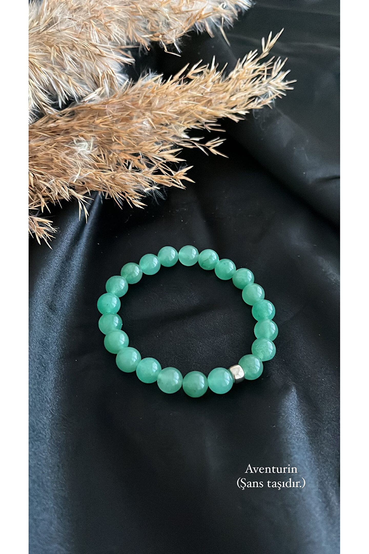 Bileklik 8 mm Aventurin doğal taştan üretilmiştir.; ; Taşlarımız gerçek doğal taştır.; ; Doğal taşlar tabiatı itibariyle kendine özgü biçimdedir ve aynı taş cinslerinde dahi ufak tefek renk tonu ve biçim farklılıkları görülebilir.; ; Bu taşın doğadaki doğal oluşumuyla ilgilidir.; ; Belli aralıklarla topraklama yöntemiyle taşınızın enerjisini temizleyip taşlarınızı arındırabilirsiniz.; ; Şans taşı olarak da bilinen Aventurin taşı faydaları, liderlik özelliklerini güçlendirme, ruh halini dengeleme, olasılıkları görmeye yardımcı olma ve karar vermeyi kolaylaştırma olarak bilinir.;