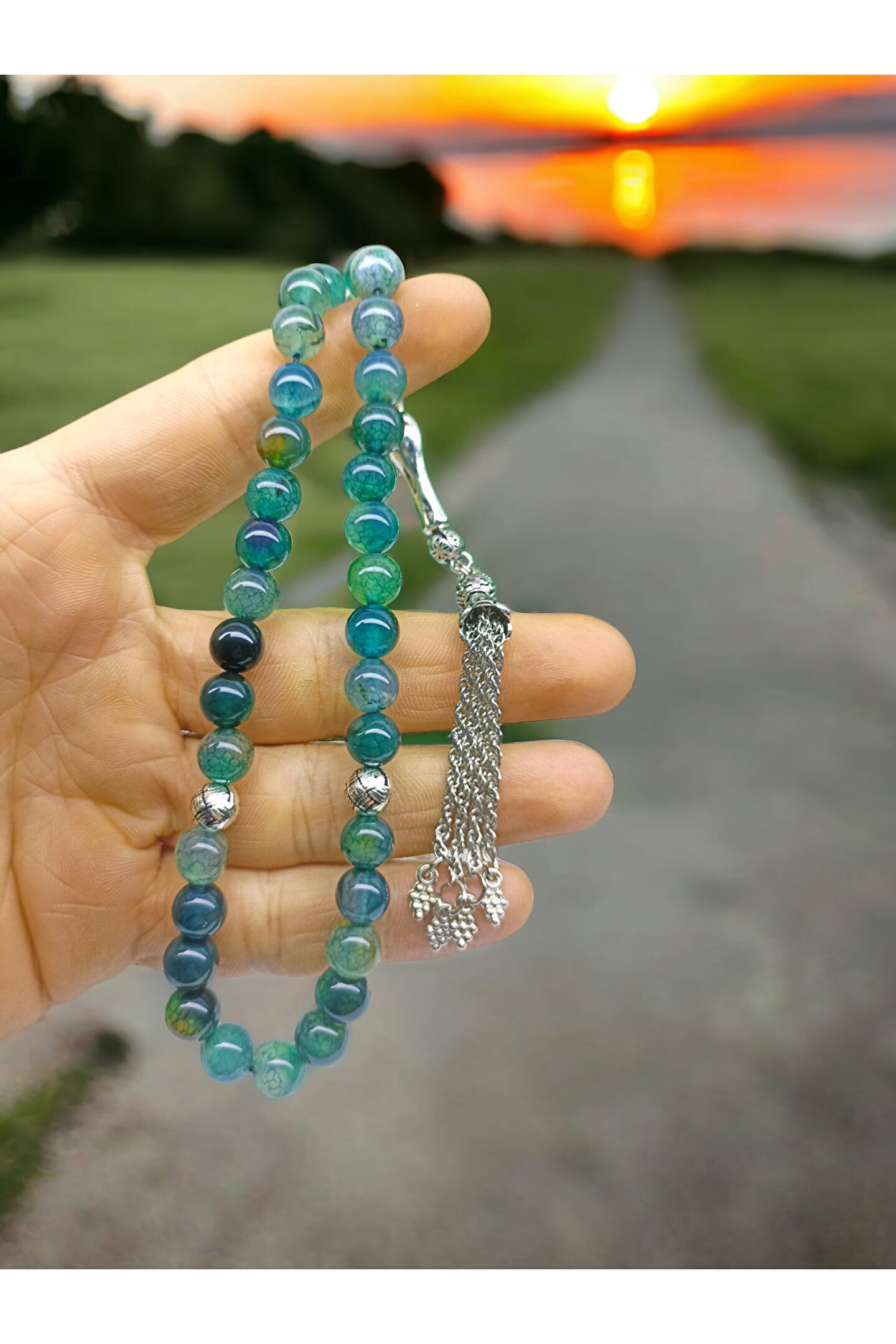 DOĞAL TAŞ MAVİ AKİK TESBİH(GÜMÜŞ KAPLAMA)(SERTİFİKALI ÖZEL KUTUSUNDA)