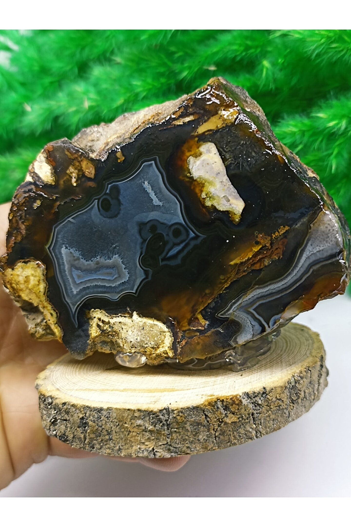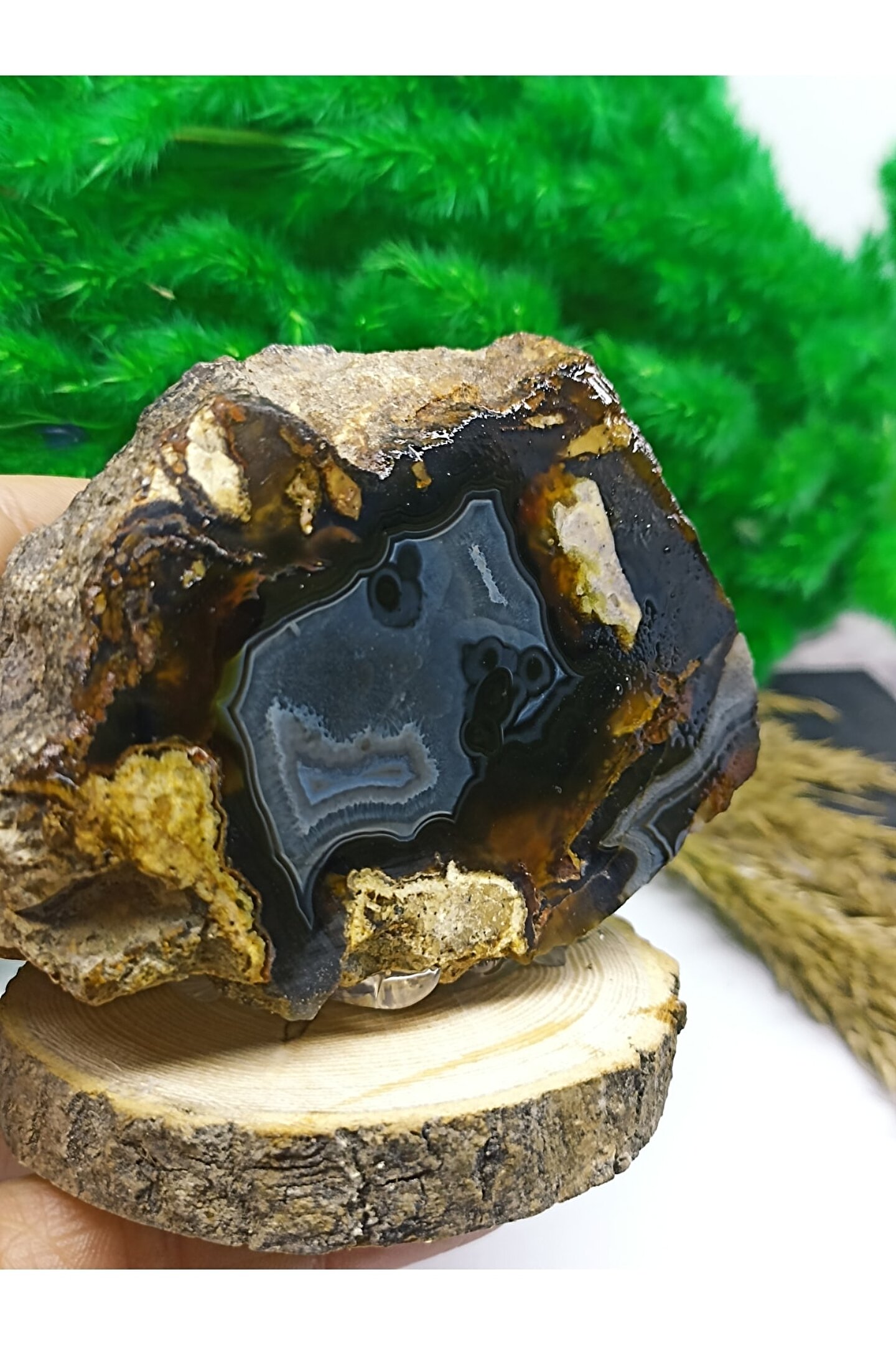 Doğal akik taşı, Madagaskar'dan temin edilmiş ve sertifikalı bir üründür, bu sayede orijinalliği ve kalitesi garanti altındadır; Ahşap stand, doğal taşın estetik görünümünü tamamlar ve dayanıklılığı artırır; Dekoratif obje olarak kullanıma uygun tasarımıyla evinizin veya ofisinizin dekorasyonuna şıklık katar;