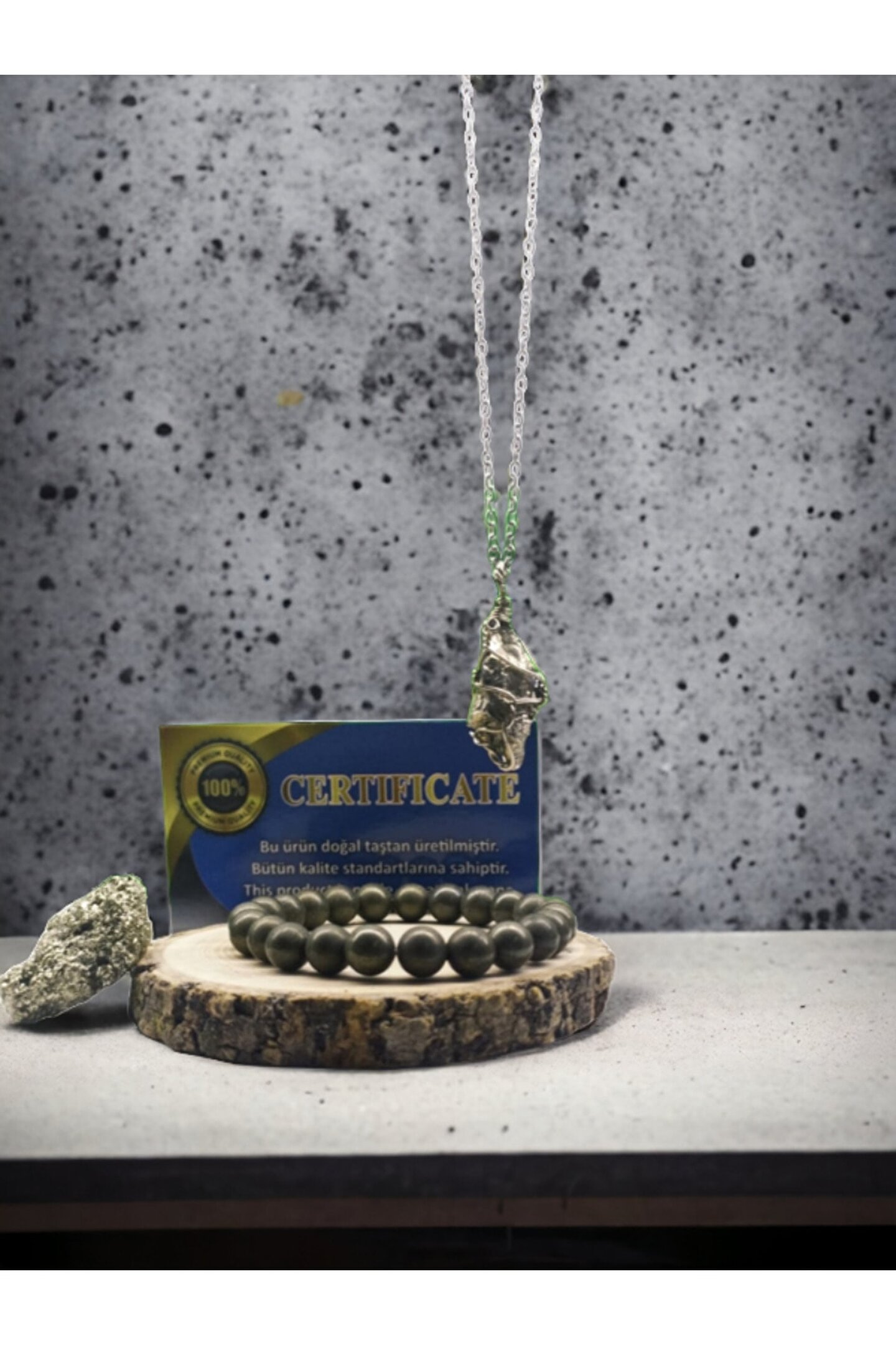 Doğal Pirit taşı kullanılarak üretilmiş, her bir bileklikte benzersiz desenler ve renkler sunar; Sertifikalı ürünümüz, kalite ve güvenilirlik açısından tüketicilere güvence verir; Taşın doğal yapısı ve dokusu, her parça benzersiz bir görünüm kazandırır ve şıklığınızı tamamlar; Pirit taşı, enerji taşı olarak bilinir ve pozitif enerjiyi yansıtarak kişisel bakımınıza katkıda bulunur;