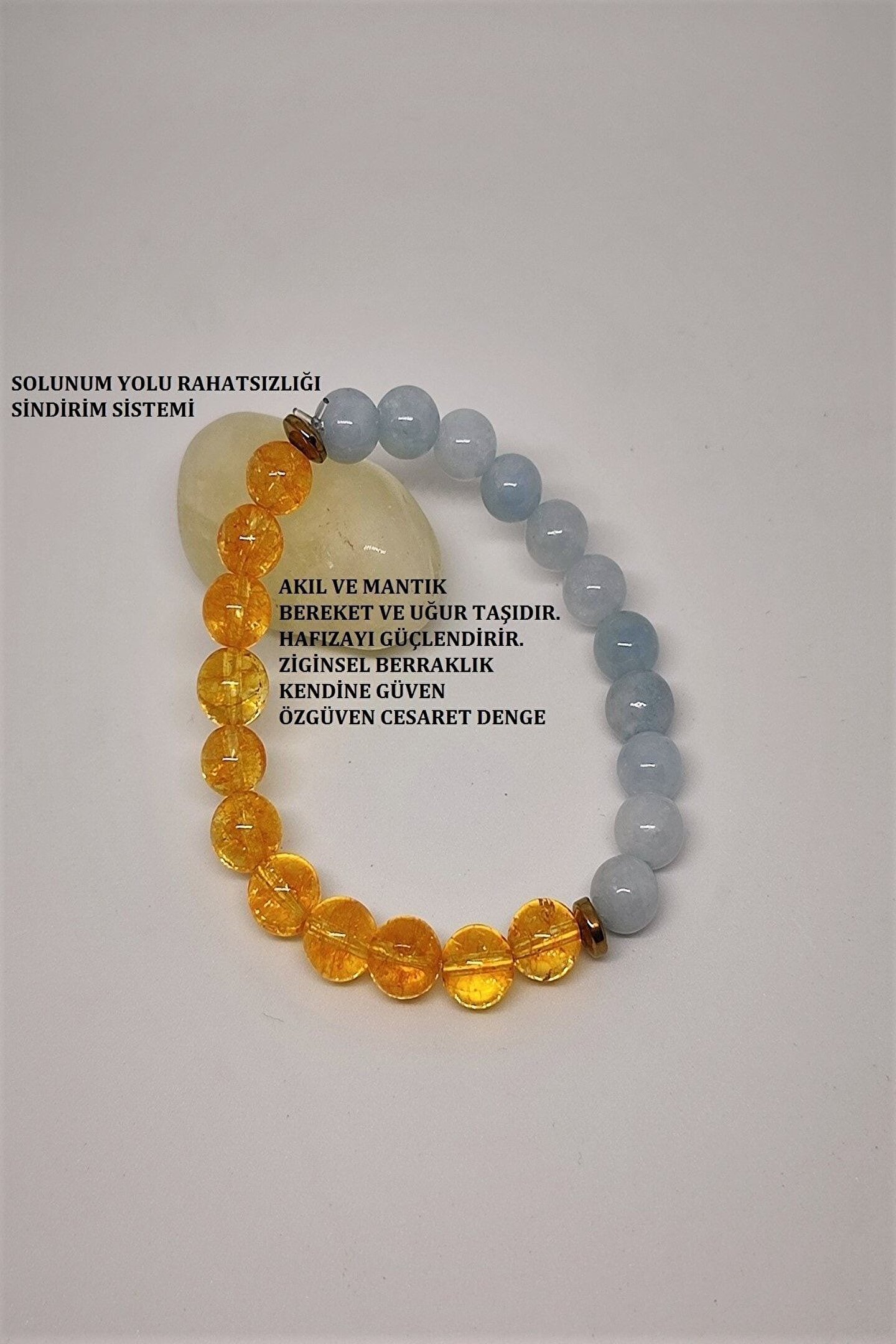 - Doğal taş kullanımı, her bir bilekliğin benzersiz ve otantik bir görünüm kazanmasını sağlar; - Sertifikalı 8 mm sitrin, akuamarin ve hematit doğaltaşları, bilekliğe zarif bir parlaklık ve renk çeşitliliği katar; - Bu bileklik, hem günlük kullanım hem de özel günler için ideal bir aksesuar seçeneği sunar;