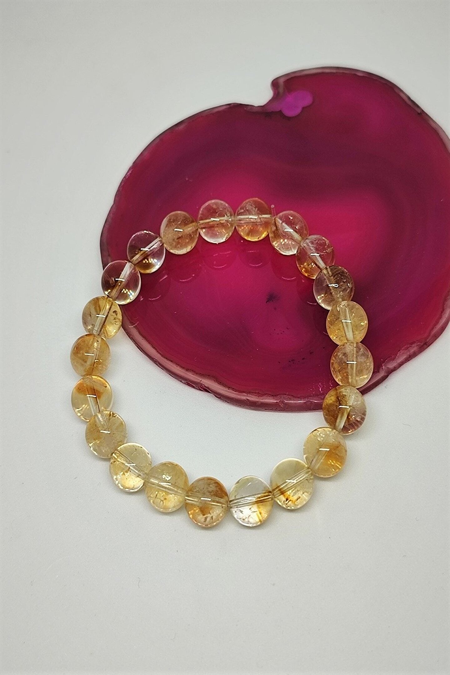 Doğal sitrin taşı kullanılarak üretilmiş, şıklığı ve zarafeti bir arada sunan bileklik; 8 mm kalınlığındaki sitrin taşı, bileklikte hem dayanıklılığı hem de estetik bir görünümü garanti eder; Sertifikalı doğaltaş kullanımı sayesinde, her bir bileklik benzersiz ve özgün bir parça olarak öne çıkar; Doğal taş materyali ile hem doğallığı hem de zarafeti bileğinizde hissedin; her kıyafetle uyum sağlayacak bir aksesuar;