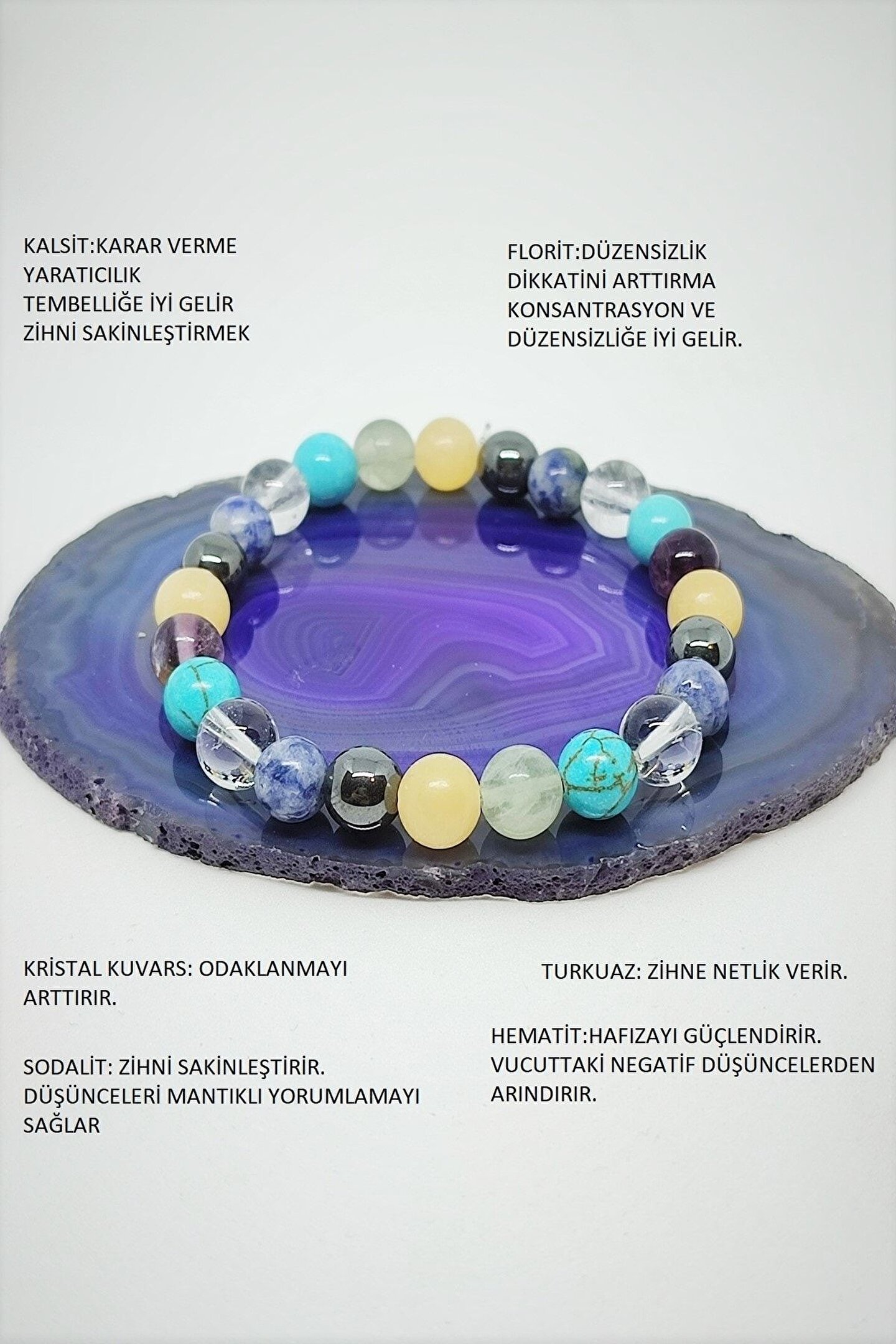 Doğal taş bileklik, her bir bileklikte bulunan kalsit, florit, hematit, sodalit, turkuaz ve kristal kuvars gibi farklı doğa taşlarından oluşur; Bu bileklikler, doğanın güzelliklerini parmaklarınıza taşıyarak şıklığınızı tamamlar ve benzersiz bir stil oluşturmanızı sağlar; Sertifikalı doğaltaş bileklik, kalite ve özgünlük açısından güvenle tercih edilebilir; her bir bileklik, doğanın saf ve doğal güzelliklerini yansıtır; Hem günlük kullanım hem de özel günler için ideal olan bu bileklikler, hem işlevsel hem de estetik bir aksesuar olarak öne çıkar;