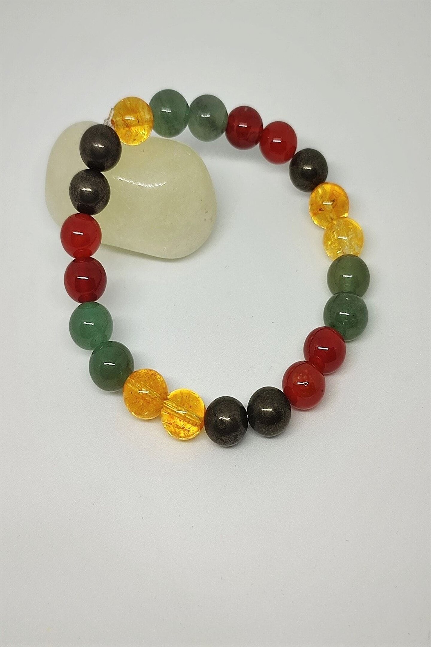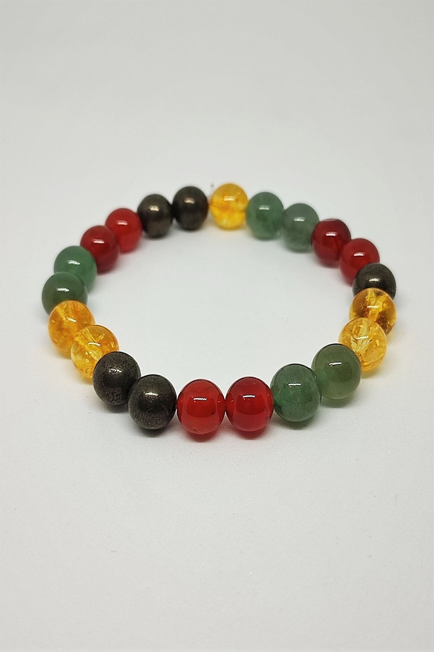 Doğal taş kullanımı sayesinde her bileklik benzersiz ve özgün bir görünüm sunar; Sertifikalı sitrin, pirit, aventurin ve akik taşları ile zenginleştirilmiş bileklik, şıklığınızı tamamlar; Doğal taşların eşsiz dokusu ve renkleri, bilekliğinize doğal bir zarafet katar; El işçiliği ile üretilmiş bu bileklik, hem günlük kullanım hem de özel günler için idealdir;
