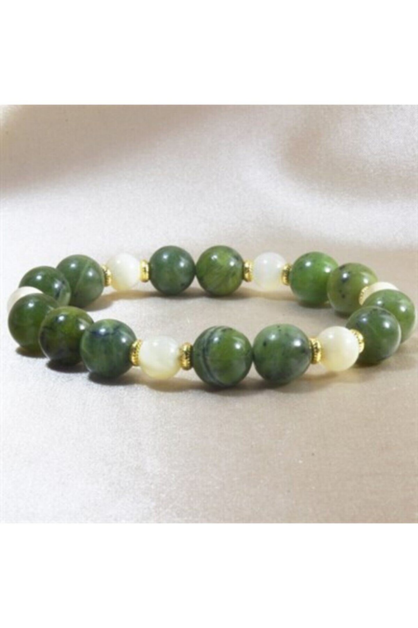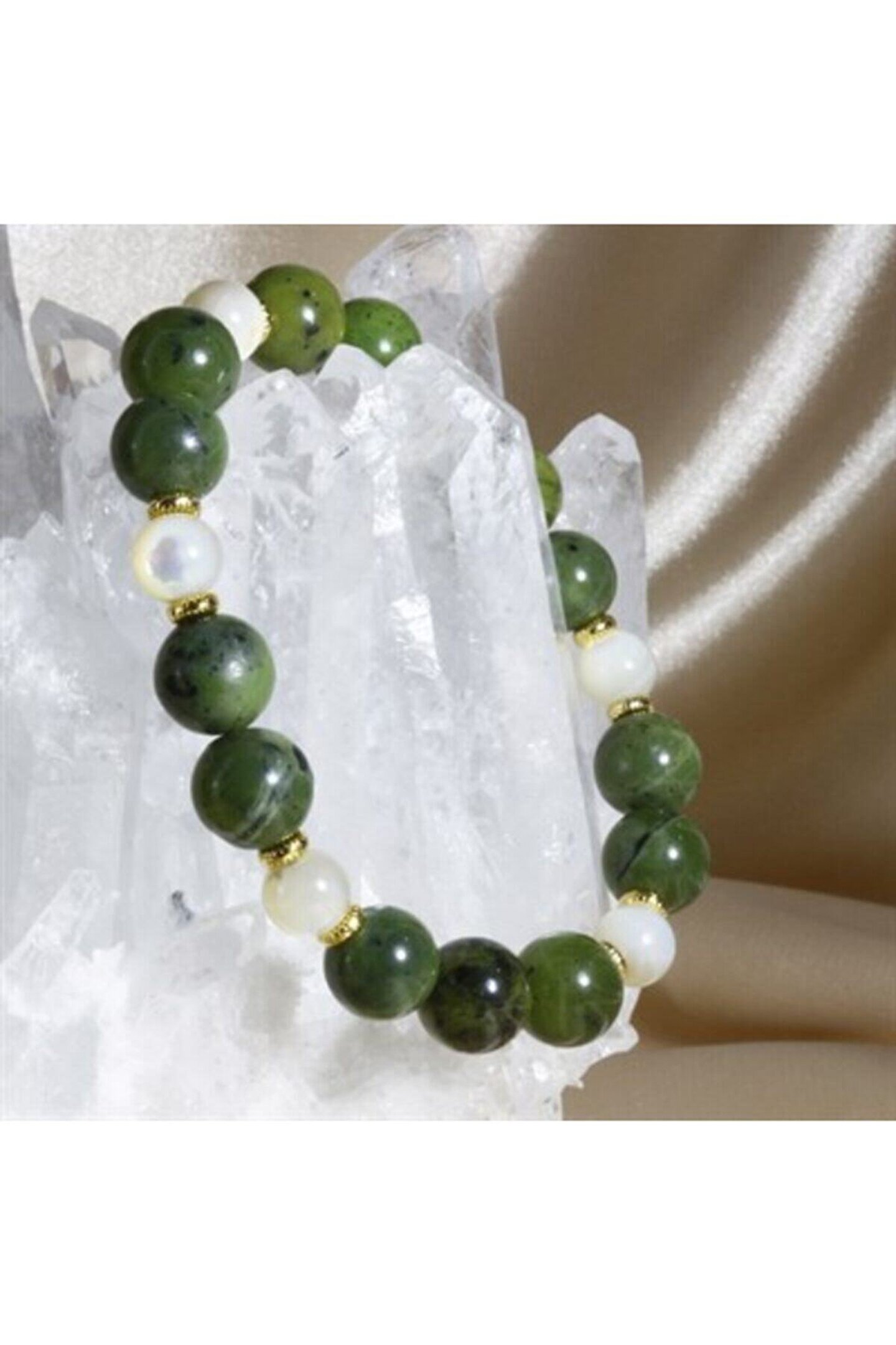 Doğal taş kullanımı, her bir Yeşim bilekliğin benzersiz ve otantik bir görünüm kazanmasını sağlar; Altın kaplama detayları ile zarif ve şık bir parlaklık sunar, her türlü kıyafetle uyum sağlar; Özel tasarımıyla dikkat çeken bu bileklik, günlük kullanım için idealdir ve özel günlerde de şıklığınızı tamamlar;