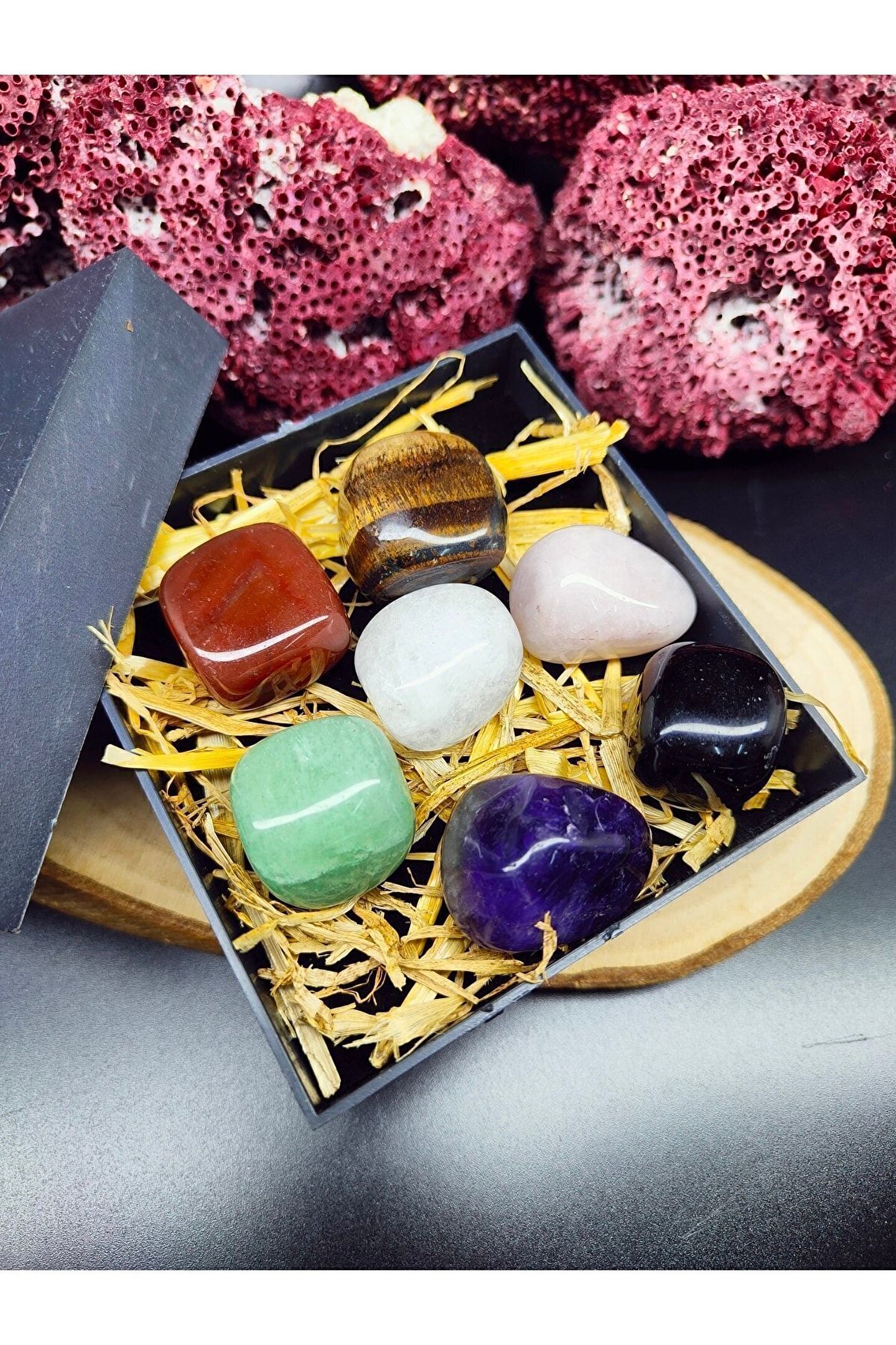 (GÖRSELDE YER ALAN TOPLAM YEDİ ADET TAŞ GÖNDERİLECEKTİR, SETİN TOPLAM AĞIRLIĞI 140-150 GRAM ARASINDA DEĞİŞMEKTEDİR YANİ TAŞ BAŞINA ORTALAMA 20 GRAM BANDINDADIR.; ; TAŞLAR GERÇEK DOĞAL TAŞ OLUP ŞEKİLSEL OLARAK DEĞİŞİKLİK GÖSTEREBİLİR.; ) -----İÇİNDEKİLER----- -Ametist -Pembe Kuvars -Oniks -Kaplan gözü -Aventurin -Kristal Kuvars -Akik Bütün çakraları açarak kişinin fiziksel ve zihinsel durumunu dengede tutar.; ; Kişiyi huzurlu ve mutlu hissettirir.; ; Kişiyi motive eder ve hayatı sevmesini sağlar.; ; Taşların enerjisini temizlemek için akan suda yıkamanız ya da toprağın altında 24 saat boyunca bekletmeniz yeterli olacaktır.; Firmamız “Taşmir”, yalnızca orijinal ve garanti kapsamındaki ürünleri satışa sunmaktadır.; Site üzerinde bazı satıcılar benzer ürünleri daha düşük fiyatlarla listeleyebilmektedir; ancak bu ürünler orijinallik garantisi taşımamakta ve yan sanayi ürün gönderme riski bulunmaktadır.; Siz değerli müşterilerimizin mağduriyet yaşamaması adına, sadece “Taşmir” mağazasından yapacağınız alışverişlerde ürünlerin orijinalliği ve garantisi firmamız tarafından güvence altına alınmaktadır.; Kaliteli ve güvenilir alışveriş için .; Saygılarımızla, Taşmir
