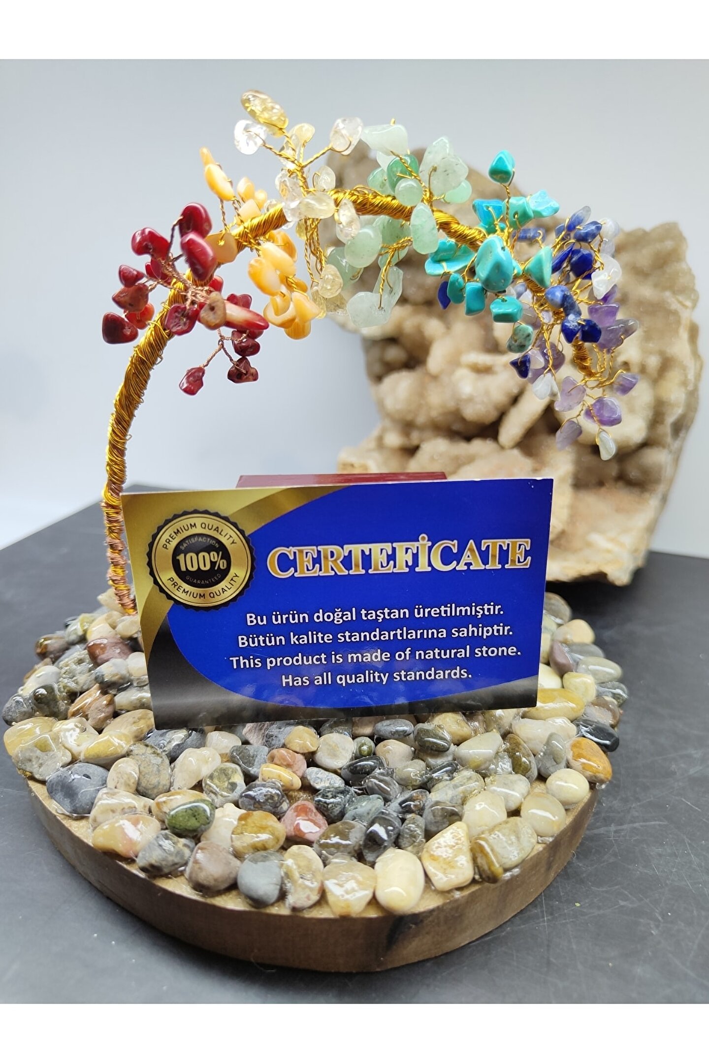 ÇAKRA TAŞI (DEKORATİF AĞAÇ) YAKLAŞIK UZUNLUK: 13 SANTİM (CM) YAKLAŞIK EN: 14 SANTİM (CM) ---ÖZELLİĞİ--- İçerisindeki taşlar: Ametist, Sodalit, Turkuaz, Aventurin, Sitrin, Kalsit, Mercan. ; Çakra Taşı Ağaç kristaller ve doğal taşlar, ruhsal, bedensel, zihinsel ve enerjisel boyutta, mekânların temizlenmesinde ve farklı pek çok alanda etkili olabilirler. ; Çakra taşları, çakranın doğal iyileşme sürecini destekleyen, çeşitli renklerde farklı taş türleridir. ; İnsan vücudundaki çakraların belirli renkleri vardır ve bu renkler, çakralar gerektiği gibi çalışmadığında değişir. ; Ortamda bulundurmayı kolaylaştırmak için çakra renklerinden hazırlanmış olan çakra ağacı, ortamın pozitif enerjisinin artmasına destek olacaktır. ; TÜM ÜRÜNLERİMİZ 30 YILLIK DOĞAL TAŞ ŞİRKETİMİZ TARAFINDAN ORJİNAL VE DOĞALLIK SERTİFİKALARIYLA GELİR...;