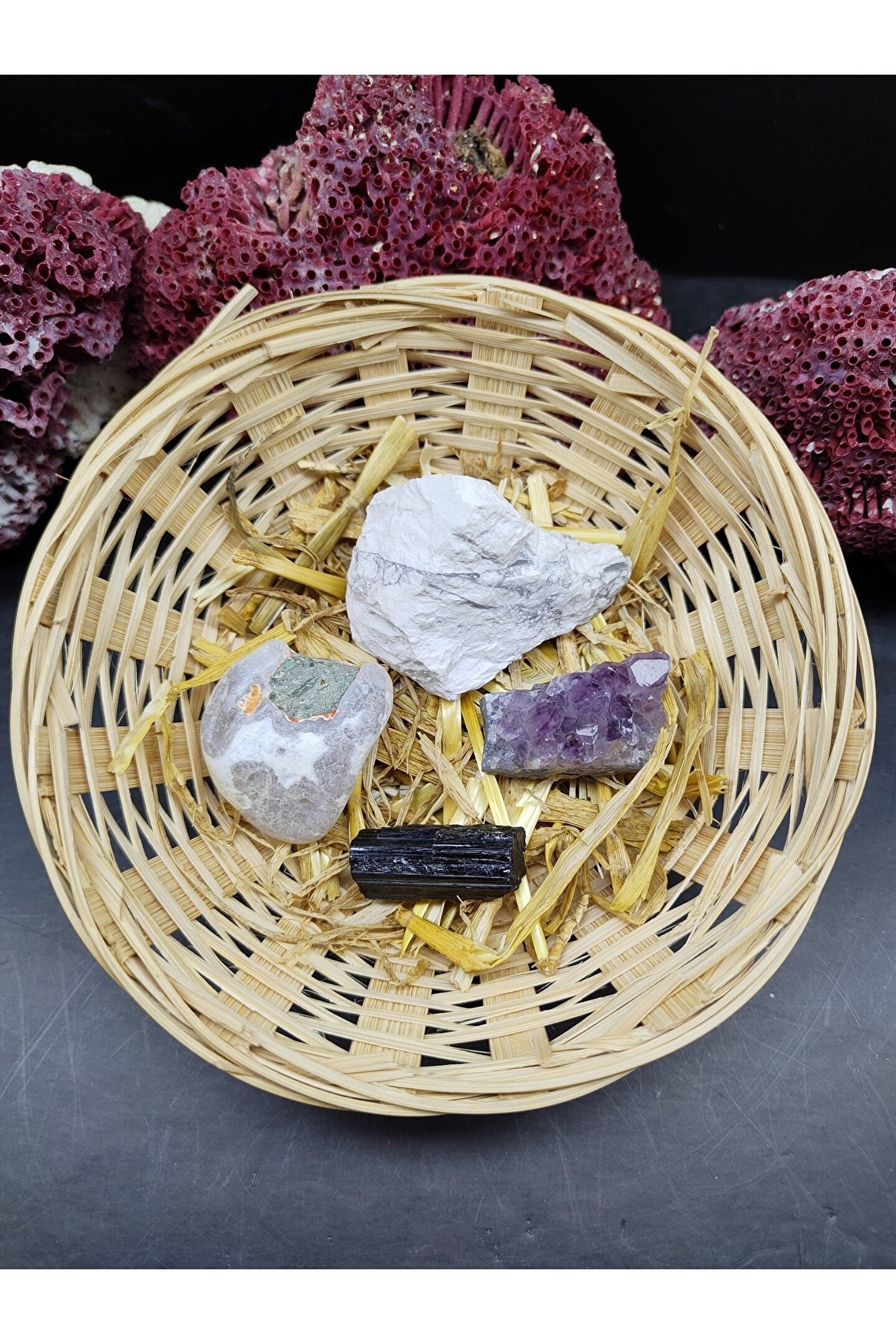 Sakinlik, Pozitif Enerji Ve Iç Huzur Için Ham Doğal Taş Seti (hasır Sepet Dahil) (sertifikalı)