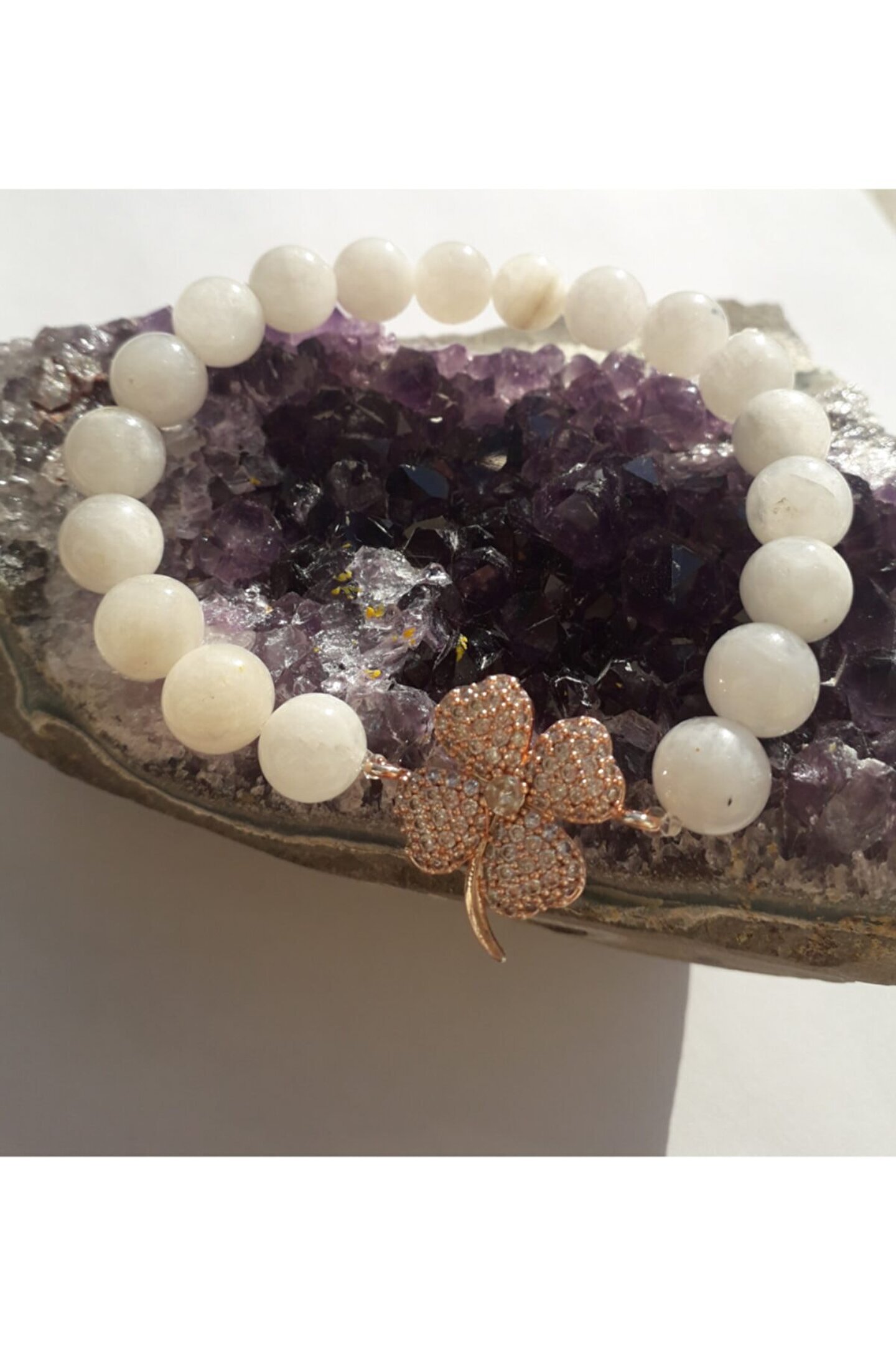 - Doğal taş kullanımı sayesinde her bileklik benzersiz ve otantik bir görünüm sunar; - Ay taşı detayı ile hem şıklığı hem de zarafeti bileğinizde hissedin; - 8mm boyutundaki bu bileklik, klasik ve modern tarzları bir arada sunarak günlük kullanım için idealdir; - Yonca aksesuarı ile bilekliğinize ekstra bir estetik dokunuş katın;