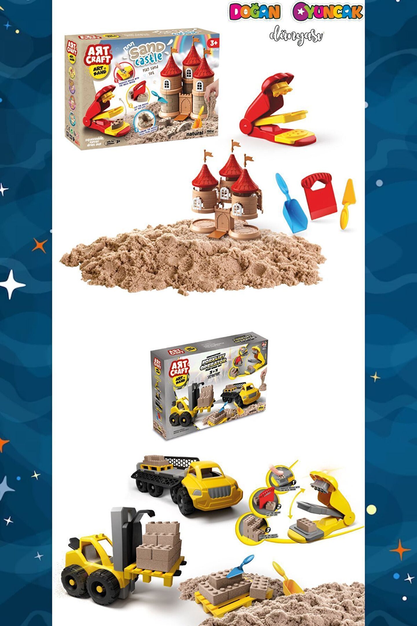 ; Doğan Oyuncak Dünyası yepyeni ve çok kaliteli bir set ile yine karşınızda! ; ; Hangi seti seçerseniz seçin çocuğunuz eğlenceye doyacaktır. ; ; Bu sette yok, yok! ; ; Bu set 2 ayrı renkli kumdan oluşmaktadır. ; ; Her renk ayrı bir kutuda gelmektedir. ; ; Set tam 2 ayrı üründen oluşmaktadır. ; ; Her ürün ayrı bir paket ile gelmektedir. ; ; Bu kinetik kum seti çok zevkli ve çok eğlenceli ; ; Çocukların azıcık bile kum sevgisi var ise, bu set o çocuk için bir harika. ; ; Görseldeki tüm setler bir paket içerisinde gelecektir. ; ; Bu harika seti kim istemez ki? ; ; Her pakette 750 gr. kinetik kum bulunmaktadır. Yani Toplam 1,5 kg. kinetik kum olacak. ; ; Görseldeki tüm aksesuarlar paketlerin içinde bulunmaktadır. ; ; Kinetik kumların kesinlikle sağlığa zararları yoktur. ; ; CE Standartlarına uygun olarak üretilmiştir. ; ; Kinetik Kum Özellikleri: Kinetik kum kesinlikle kurumaz, tek yapmamanız gereken şey ıslak elle oynamamak. ; ; Tüm setin, tüm parçaları Türkiye'de üretilmiştir. ; ; Sağlığa herhangi bir zararı yoktur. ; ; Seçtiğiniz varyasyondaki set size gelecektir. ; ; Görseldeki tüm parçalar beraber gelecektir. ; ;