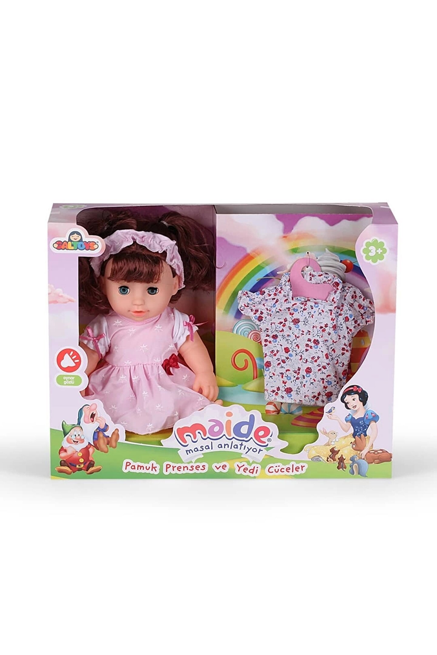 Kimmiş o konuşan bebek?; Bu harika bebeği kim istemezki!; Prenses ve 7 cüceler masalını anlatıyor.; ; 5 cümlesi bulunmaktadır.; ; 33 cm.; boyutundadır.; ; Oynar gözlüdür.; ; Bu bebekte yok yok.; ; Elbisesi yanında hediyelidir.; ; Çocukların bir numaralı eğlencesi olucak bu bebeğe sizde sahip olmak istemezmisiniz.; ; Konuştuğu kelimeler;; Saçımı kurutur musun,; Elbisemi değiştir meliyim,; Hadi gezmeye gidelim,; Bi kahve içelim mi?; Saçımı tarar mısın?;