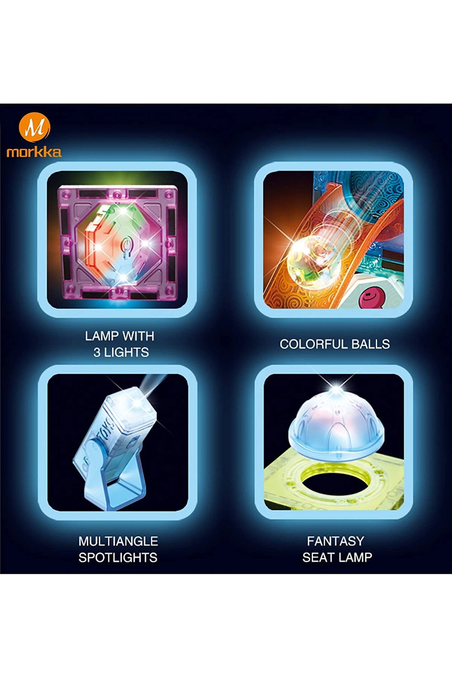 Setin içindeki ışıklı parçalar, çocukların oyunlarını daha büyüleyici hale getirir. Renkli bloklar hem dikkat çekici hem de öğrenmeyi destekleyici bir oyun ortamı sunar.