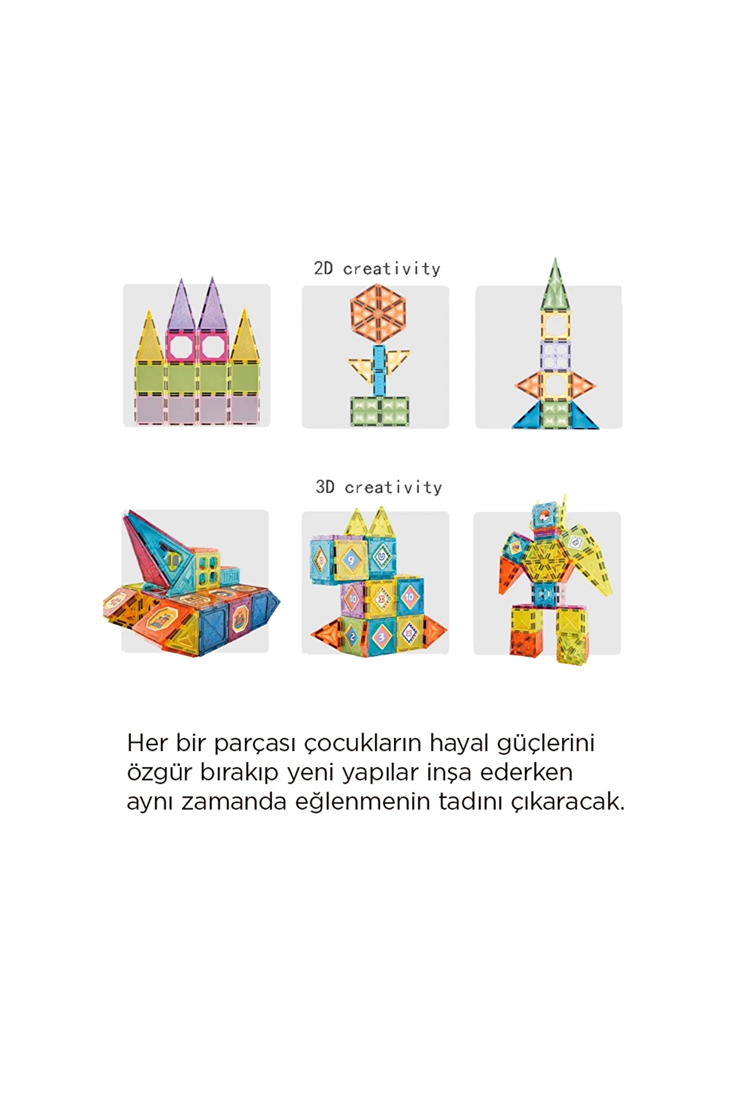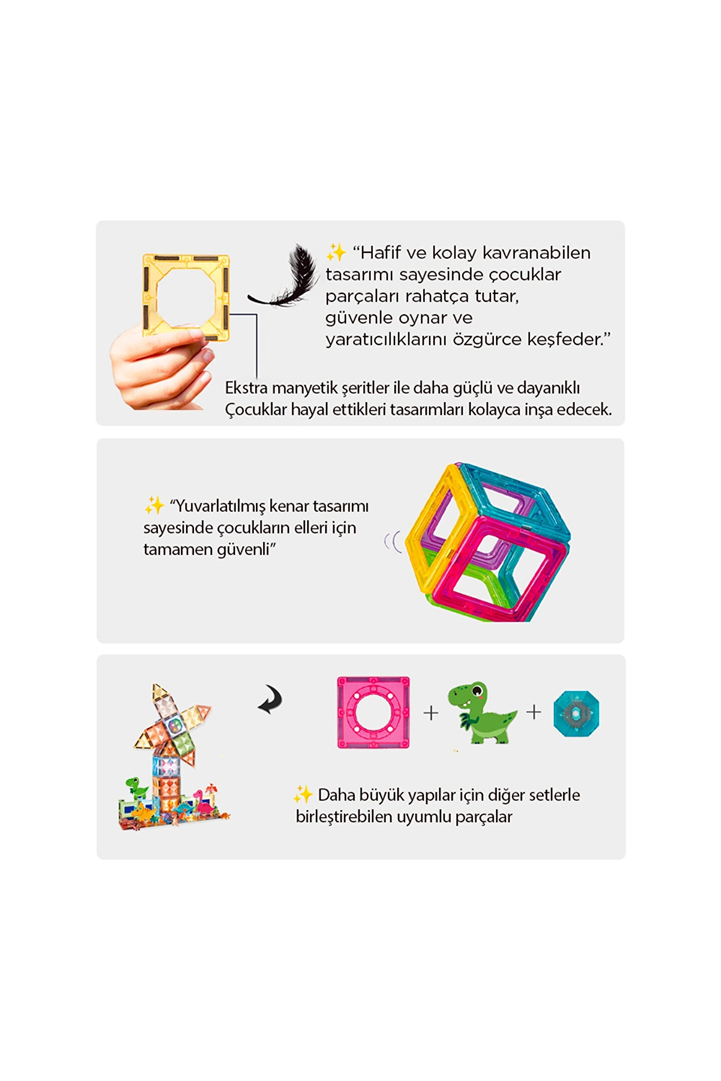 Dayanıklı malzemeden üretilen bu set, güçlü mıknatısları sayesinde kolayca birleşiyor ve çocukların diledikleri yapıları güvenle inşa edebilmelerine olanak tanıyor.