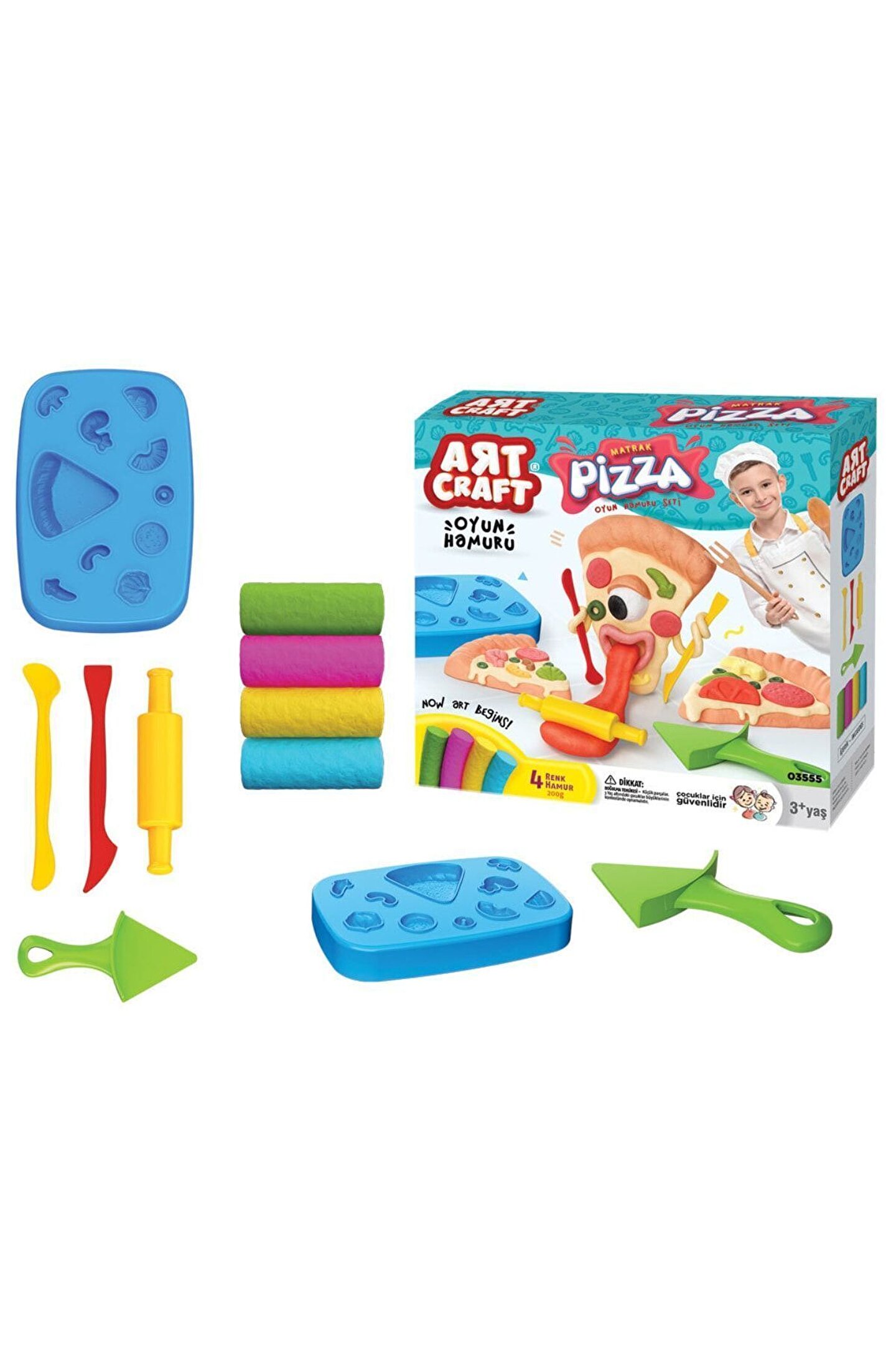 - 3 yaş ve üzeri çocuklar için ideal, eğlenceli ve yaratıcı oyun saatleri sunar; - 200 gram ağırlığındaki pizza hamuru seti, çocukların kolayca şekillendirip pizza yapmalarını sağlar; - Hamur kalıpları ile birlikte gelen bu set, çocukların farklı pizza çeşitleri yaratmasına olanak tanır; - Çocukların motor becerilerini ve el-göz koordinasyonunu geliştirmeye yardımcı olurken, aynı zamanda eğlenceli vakit geçirmelerini sağlar;