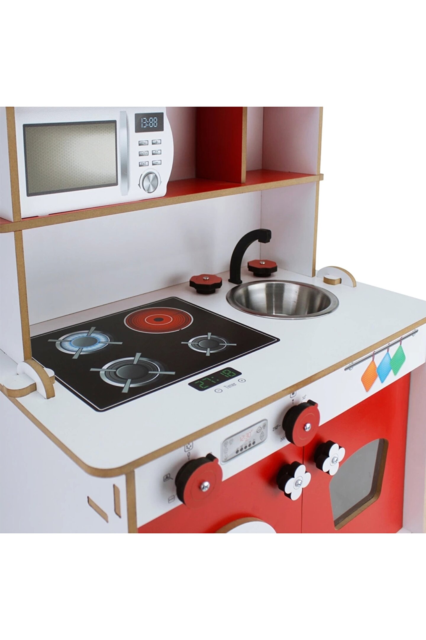 Pratik Hamarat Ahşap Mutfak - Ahşap Çocuk Mutfağı - Mutfak Seti - Kapaklı Mutfak - Kırmızı
