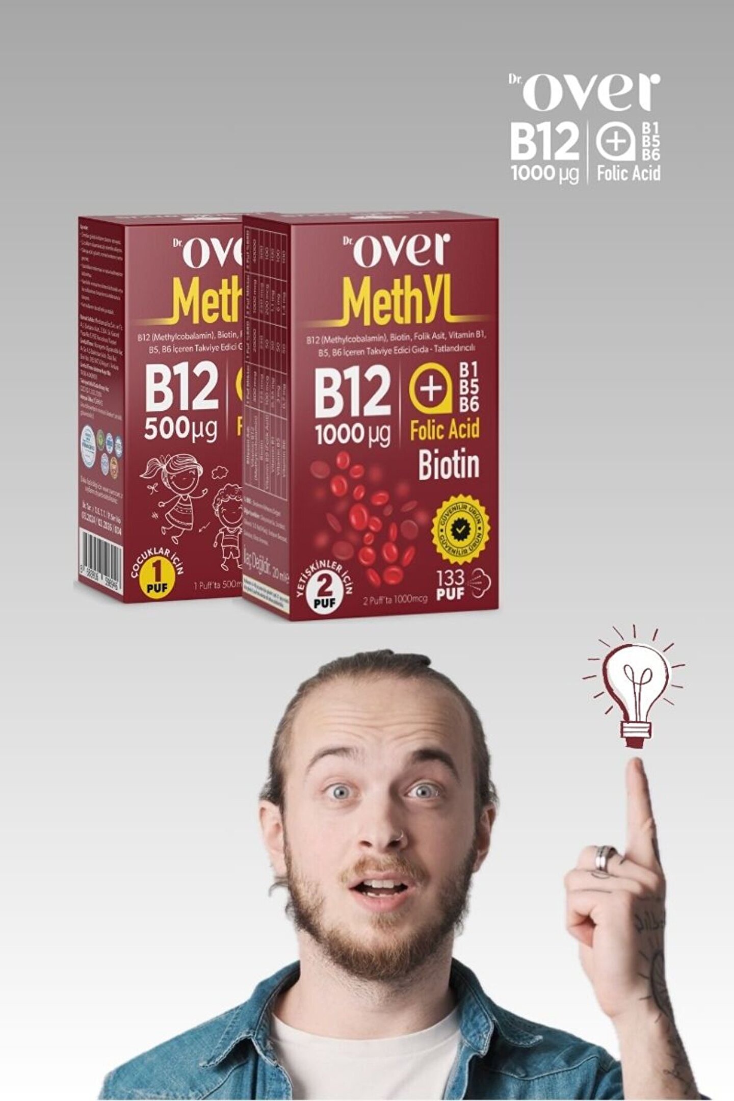 Kullanım şekli; Çocuklar için günde 1 puf.; Yetişkinlerde 2 puf.; Modern yaşamın getirdiği yoğun tempo, beslenme alışkanlıklarındaki değişiklikler, yaş gibi faktörler bazen vücudumuzun ihtiyaç duyduğu vitaminleri yeterince almanızı zorlaştırabilir.; Büyüme çağındaki çocukların B12 vitamini ihtiyacı yüksektir.; B12 vitamini takviyesi, günlük beslenme ile yeterli miktarda B12 vitamini alamayanlar için ideal bir çözümdür.; B12 vitamini, yorgunluk ve bitkinliğin azalmasına, normal enerji oluşum metabolizmasına, sinir sisteminin normal işleyişine, normal kırmızı kan hücresi oluşumuna, homosistein metabolizmasına ve bağışıklık sisteminin normal fonksiyonuna katkıda bulunur.; Dr.; Over B12 Plus’ın içeriğindeki diğer bileşenler (Biotin, Folik asit, Vitamin B1, B5 ve B6), B12 vitamininin farklı kulvarlardaki etkinliğini destekleyici etkilere sahiptir.; Ayrıca ürün vejetaryenlerin kullanımına uygundur.