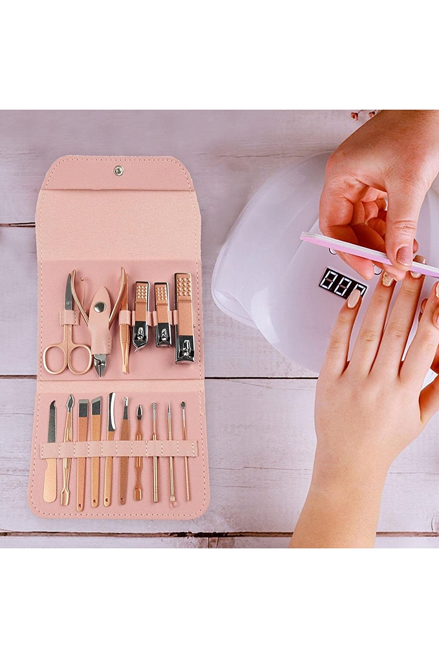DUHALINE 16 Parça Profesyonel Çelik Paslanmaz Deri Çantalı Manikür Pedikür Tırnak Yüz Bakım Seti -pudra Pembe