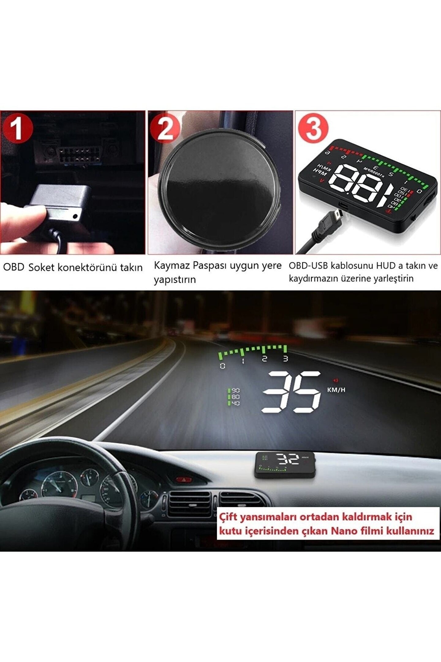 Kullanım Talimatı Ürün, OBD girişi olan araçlarda çalışır. Cihazı araca bağladıktan sonra, kontağı açarak ekrandaki değerleri takip edebilirsiniz. Ekranda hararet, hız, devir ve voltaj bilgileri gösterilir. Ürün, araç beyninden (ECU) aldığı verileri yansıtır. Doğru ölçüm için cihazın bağlantısının sağlam olduğundan emin olunuz. Araç üreticisinin bakım ve kullanım talimatlarını dikkate alınız.