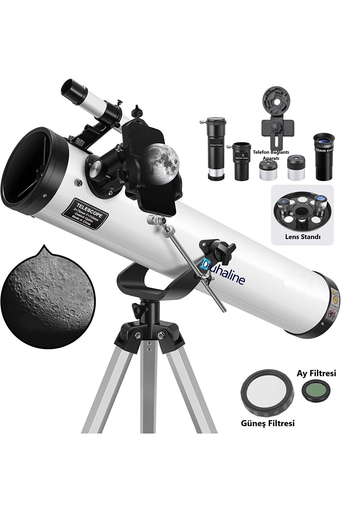 Reflektör Teleskop 76mm Diyafram 700mm Odak 35X-875X Zoom Ay & Güneş Filtresi+Telefon Tutucu+Tripod